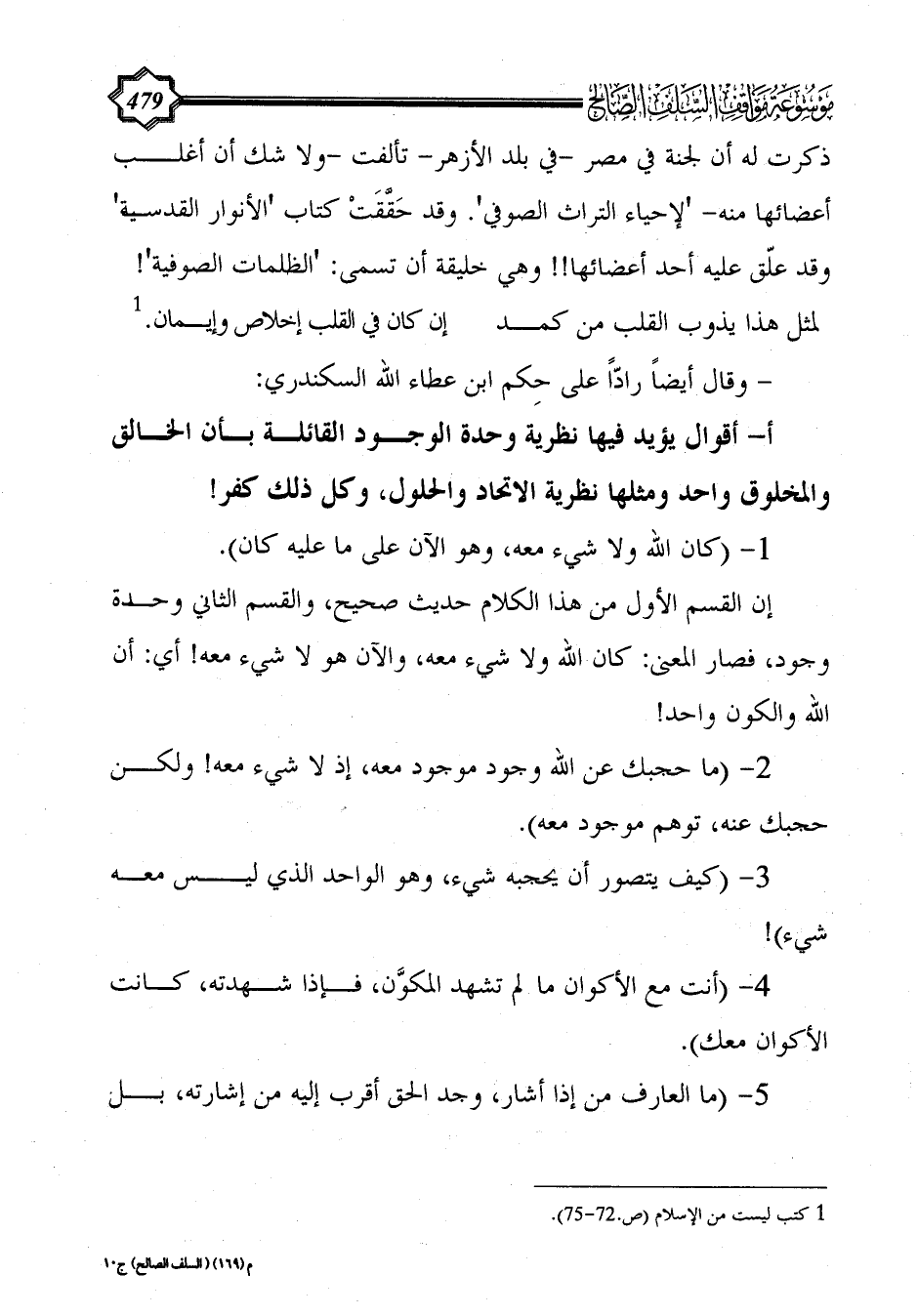 ذكرت له أن لجنة في مصر -في بلد الأزهر- تألفت -ولا شك أن أغلب أعضائها منه- 'لإحياء التراث الصوفي'. وقد حَقَّقَتْ كتاب 'الأنوار القدسية' وقد علّق عليه أحد أعضائها!! وهي خليقة أن تسمى: 'الظلمات الصوفية'!