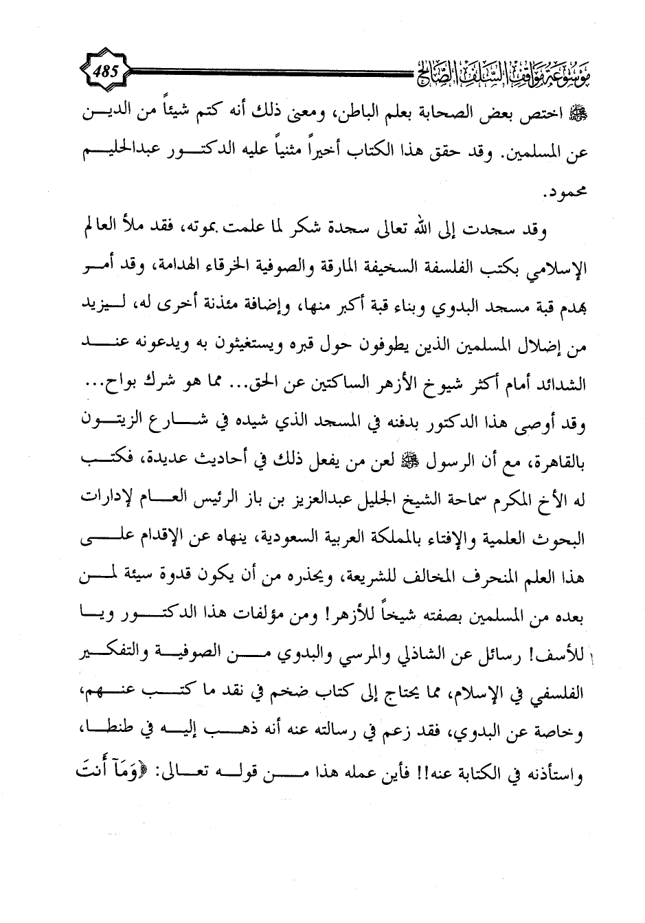 وقد سجدت إلى الله تعالى سجدة شكر لما علمت بموته، فقد ملأ العالم الإسلامي بكتب الفلسفة السخيفة المارقة والصوفية الخرقاء الهدامة، وقد أمر بهدم قبة مسجد البدوي وبناء قبة أكبر منها، وإضافة مئذنة أخرى له، ليزيد من إضلال المسلمين الذين يطوفون حول قبره ويستغيثون به ويدعونه عند الشدائد أمام أكثر شيوخ الأزهر الساكتين عن الحق ... مما هو شرك بواح ... وقد أوصى هذا الدكتور بدفنه في المسجد الذي شيده في شارع الزيتون بالقاهرة، مع أن الرسول - صلى الله عليه وسلم - لعن من يفعل ذلك في أحاديث عديدة، فكتب له الأخ المكرم سماحة الشيخ الجليل عبد العزيز بن باز الرئيس العام لإدارات البحوث العلمية والإفتاء بالمملكة العربية السعودية، ينهاه عن الإقدام على هذا العلم المنحرف المخالف للشريعة، ويحذره من أن يكون قدوة سيئة لمن بعده من المسلمين بصفته شيخاً للأزهر! ومن مؤلفات هذا الدكتور ويا للأسف! رسائل عن الشاذلي والمرسي والبدوي من الصوفية والتفكير الفلسفي في الإسلام، مما يحتاج إلى كتاب ضخم في نقد ما كتب عنهم، وخاصة عن البدوي، فقد زعم في رسالته عنه أنه ذهب إليه في طنطا، واستأذنه في الكتابة عنه!! فأين عمله هذا من قوله تعالى: {وَمَا أَنْتَ