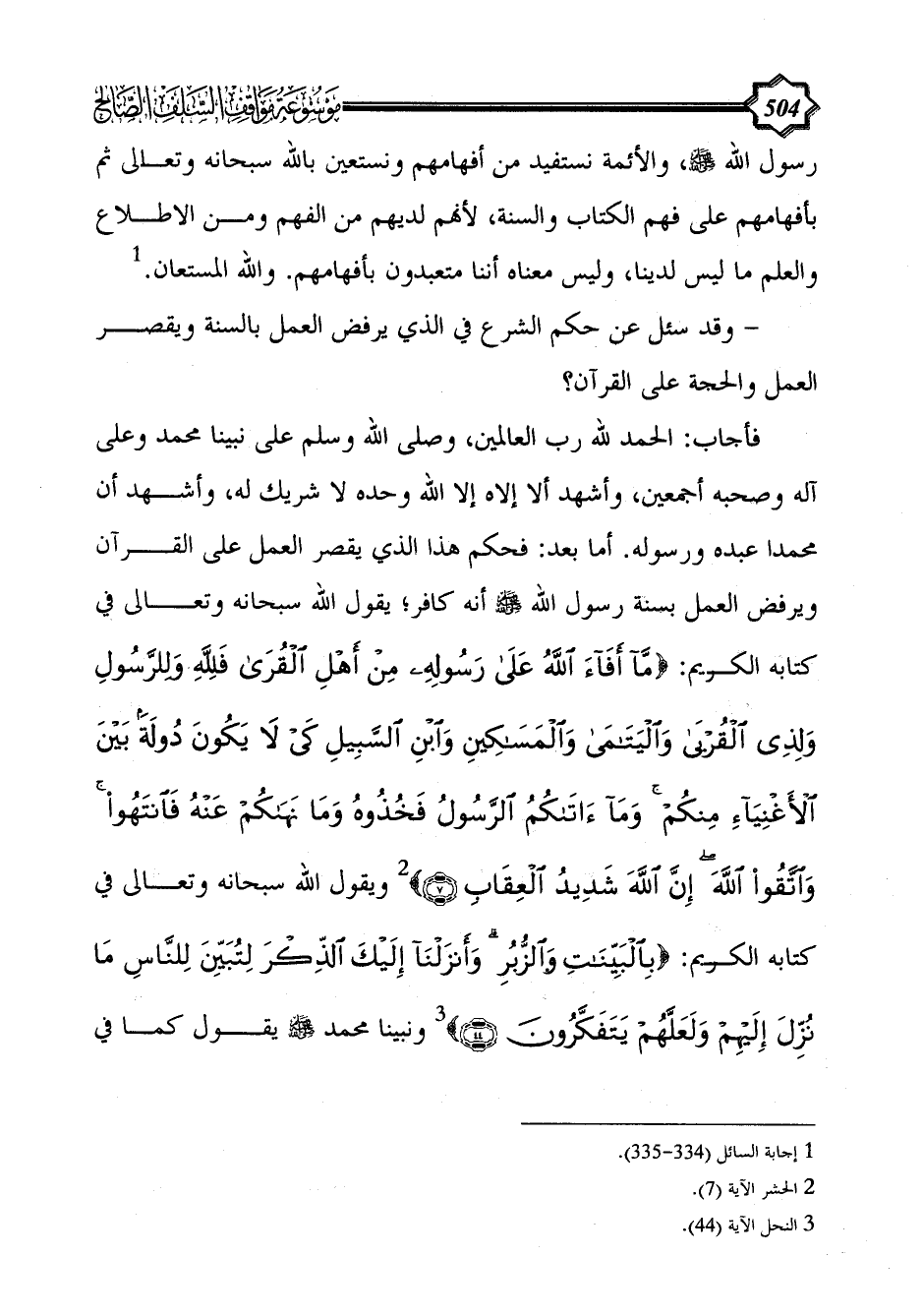 فأجاب: الحمد لله رب العالمين، وصلى الله وسلم على نبينا محمد وعلى آله وصحبه أجمعين، وأشهد ألا إلاه إلا الله وحده لا شريك له، وأشهد أن محمدا عبده ورسوله. أما بعد: فحكم هذا الذي يقصر العمل على القرآن ويرفض العمل بسنة رسول الله - صلى الله عليه وسلم - أنه كافر؛ يقول الله سبحانه وتعالى في كتابه الكريم: {مَا أَفَاءَ اللَّهُ عَلَى رَسُولِهِ مِنْ أَهْلِ الْقُرَى فَلِلَّهِ وَلِلرَّسُولِ وَلِذِي الْقُرْبَى وَالْيَتَامَى وَالْمَسَاكِينِ وَابْنِ السَّبِيلِ كَيْ لَا يَكُونَ دُولَةً بَيْنَ الْأَغْنِيَاءِ مِنْكُمْ وَمَا آَتَاكُمُ الرَّسُولُ فَخُذُوهُ وَمَا نَهَاكُمْ عَنْهُ فَانْتَهُوا وَاتَّقُوا اللَّهَ إِنَّ اللَّهَ شَدِيدُ الْعِقَابِ (7)} (¬2) ويقول الله سبحانه وتعالى في كتابه الكريم: {بِالْبَيِّنَاتِ والزبر وَأَنْزَلْنَا إِلَيْكَ الذِّكْرَ لِتُبَيِّنَ لِلنَّاسِ مَا نُزِّلَ إِلَيْهِمْ وَلَعَلَّهُمْ يَتَفَكَّرُونَ (44)} (¬3) ونبينا محمد - صلى الله عليه وسلم - يقول كما في