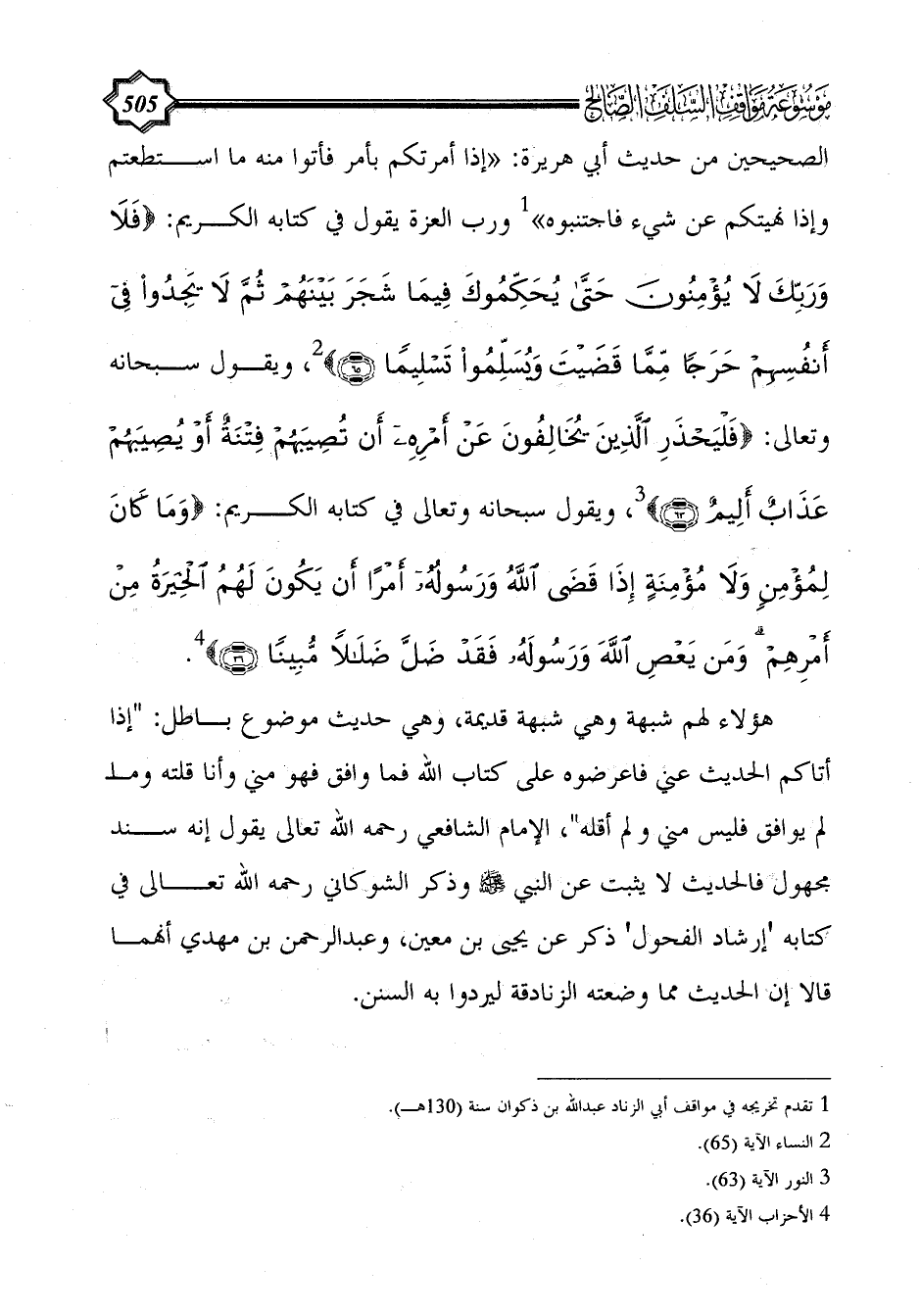 ويقول سبحانه وتعالى في كتابه الكريم: {وَمَا كَانَ لِمُؤْمِنٍ وَلَا مُؤْمِنَةٍ إِذَا قَضَى اللَّهُ وَرَسُولُهُ أَمْرًا أَنْ يَكُونَ لَهُمُ الْخِيَرَةُ مِنْ أَمْرِهِمْ وَمَنْ يَعْصِ اللَّهَ وَرَسُولَهُ فَقَدْ ضَلَّ ضَلَالًا مُبِينًا (36)} (¬4).