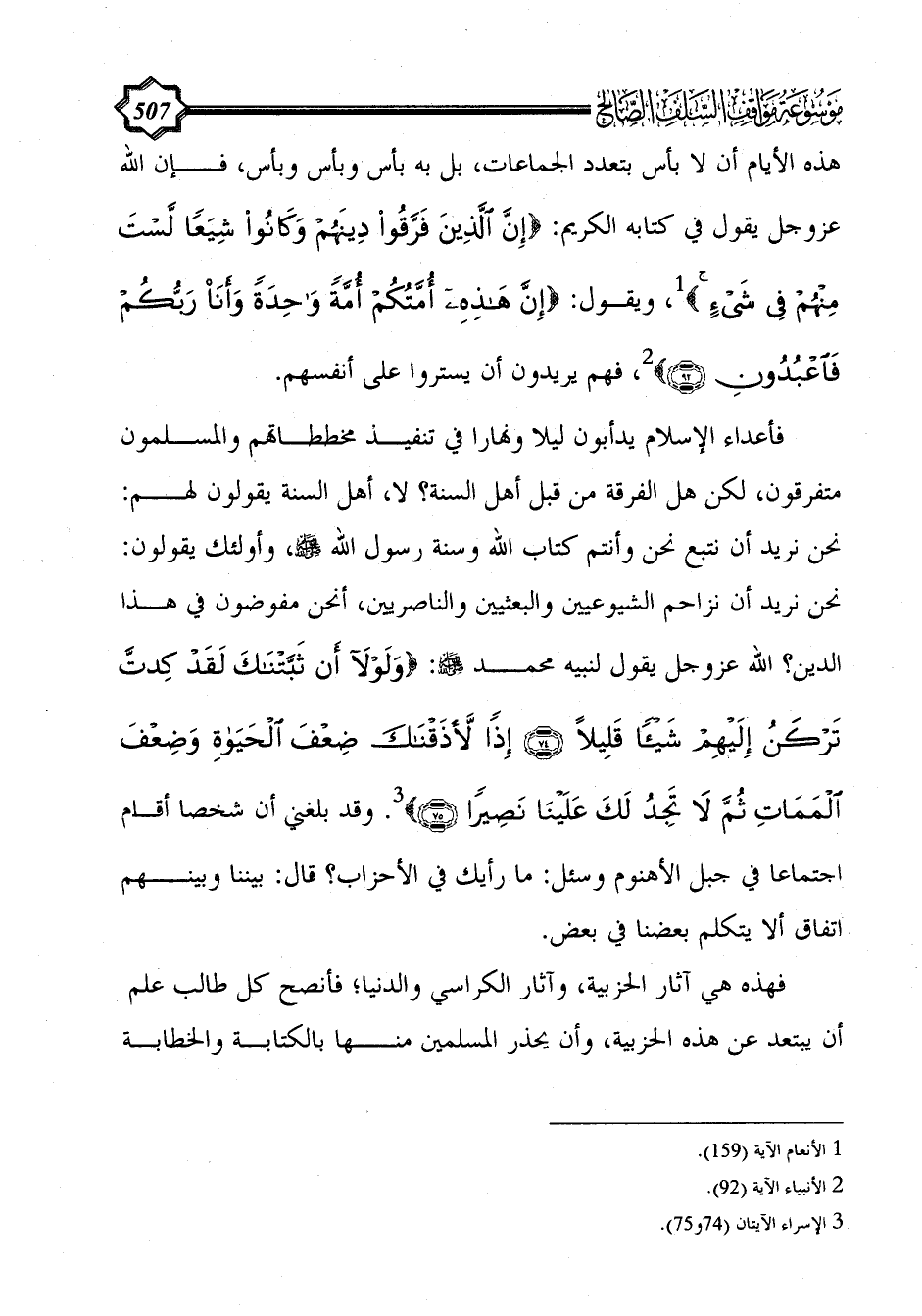 فأعداء الإسلام يدأبون ليلا ونهارا في تنفيذ مخططاتهم والمسلمون متفرقون، لكن هل الفرقة من قبل أهل السنة؟ لا، أهل السنة يقولون لهم: نحن نريد أن نتبع نحن وأنتم كتاب الله وسنة رسول الله - صلى الله عليه وسلم -، وأولئك يقولون: نحن نريد أن نزاحم الشيوعيين والبعثيين والناصريين، أنحن مفوضون في هذا الدين؟ الله عزوجل يقول لنبيه محمد - صلى الله عليه وسلم -: {وَلَوْلَا أَنْ ثَبَّتْنَاكَ لَقَدْ كِدْتَ تَرْكَنُ إِلَيْهِمْ شَيْئًا قَلِيلًا (74) إِذًا لَأَذَقْنَاكَ ضِعْفَ الْحَيَاةِ وَضِعْفَ الْمَمَاتِ ثُمَّ لَا تَجِدُ لَكَ عَلَيْنَا نَصِيرًا (75)} (¬3). وقد بلغني أن شخصا أقام اجتماعا في جبل الأهنوم وسئل: ما رأيك في الأحزاب؟ قال: بيننا وبينهم اتفاق ألا يتكلم بعضنا في بعض.