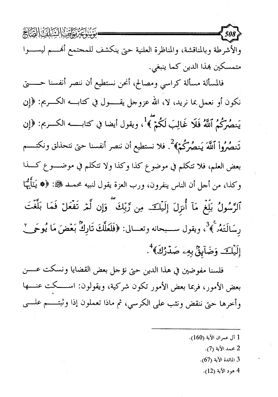 فالمسألة مسألة كراسي ومصالح، أنحن نستطيع أن ننصر أنفسنا حتى نكون أو نعمل بما نريد، لا، الله عزوجل يقول في كتابه الكريم: {إِنْ يَنْصُرْكُمُ اللَّهُ فَلَا غَالِبَ لَكُمْ} (¬1)، ويقول أيضا في كتابه الكريم: {إِنْ تَنْصُرُوا اللَّهَ يَنْصُرْكُمْ} (¬2). فلا نستطيع أن ننصر أنفسنا حتى نتحذلق ونكتم بعض العلم، فلا تتكلم في موضوع كذا وكذا ولا تتكلم في موضوع كذا وكذا، من أجل أن الناس ينفرون، ورب العزة يقول لنبيه محمد - صلى الله عليه وسلم -: {* يَا أَيُّهَا الرَّسُولُ بَلِّغْ مَا أُنْزِلَ إِلَيْكَ مِنْ رَبِّكَ وَإِنْ لَمْ تَفْعَلْ فَمَا بَلَّغْتَ رِسَالَتَهُ} (¬3)، ويقول سبحانه وتعالى: {فَلَعَلَّكَ تَارِكٌ بَعْضَ مَا يُوحَى إِلَيْكَ وضائقٌ بِهِ صَدْرُكَ} (¬4).