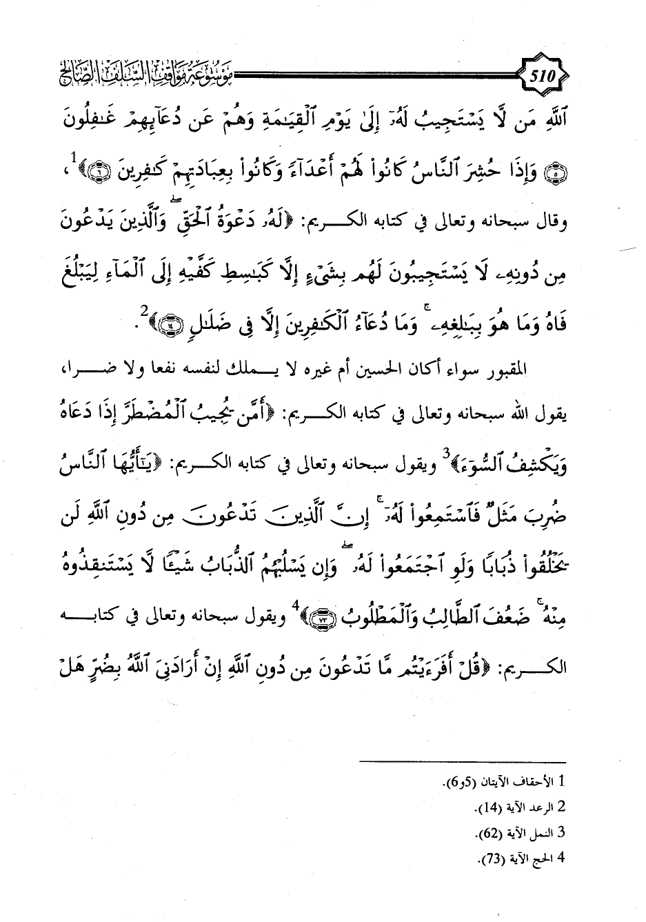 اللَّهِ مَنْ لَا يَسْتَجِيبُ لَهُ إِلَى يَوْمِ الْقِيَامَةِ وَهُمْ عَنْ دعائهم غَافِلُونَ (5) وَإِذَا حُشِرَ النَّاسُ كَانُوا لَهُمْ أَعْدَاءً وَكَانُوا بِعِبَادَتِهِمْ كَافِرِينَ (6)} (¬1)، وقال سبحانه وتعالى في كتابه الكريم: {لَهُ دَعْوَةُ الْحَقِّ وَالَّذِينَ يَدْعُونَ مِنْ دُونِهِ لَا يَسْتَجِيبُونَ لَهُمْ بِشَيْءٍ إِلَّا كَبَاسِطِ كَفَّيْهِ إِلَى الْمَاءِ لِيَبْلُغَ فَاهُ وَمَا هُوَ بِبَالِغِهِ وَمَا دُعَاءُ الْكَافِرِينَ إِلَّا فِي ضَلَالٍ (14)} (¬2).