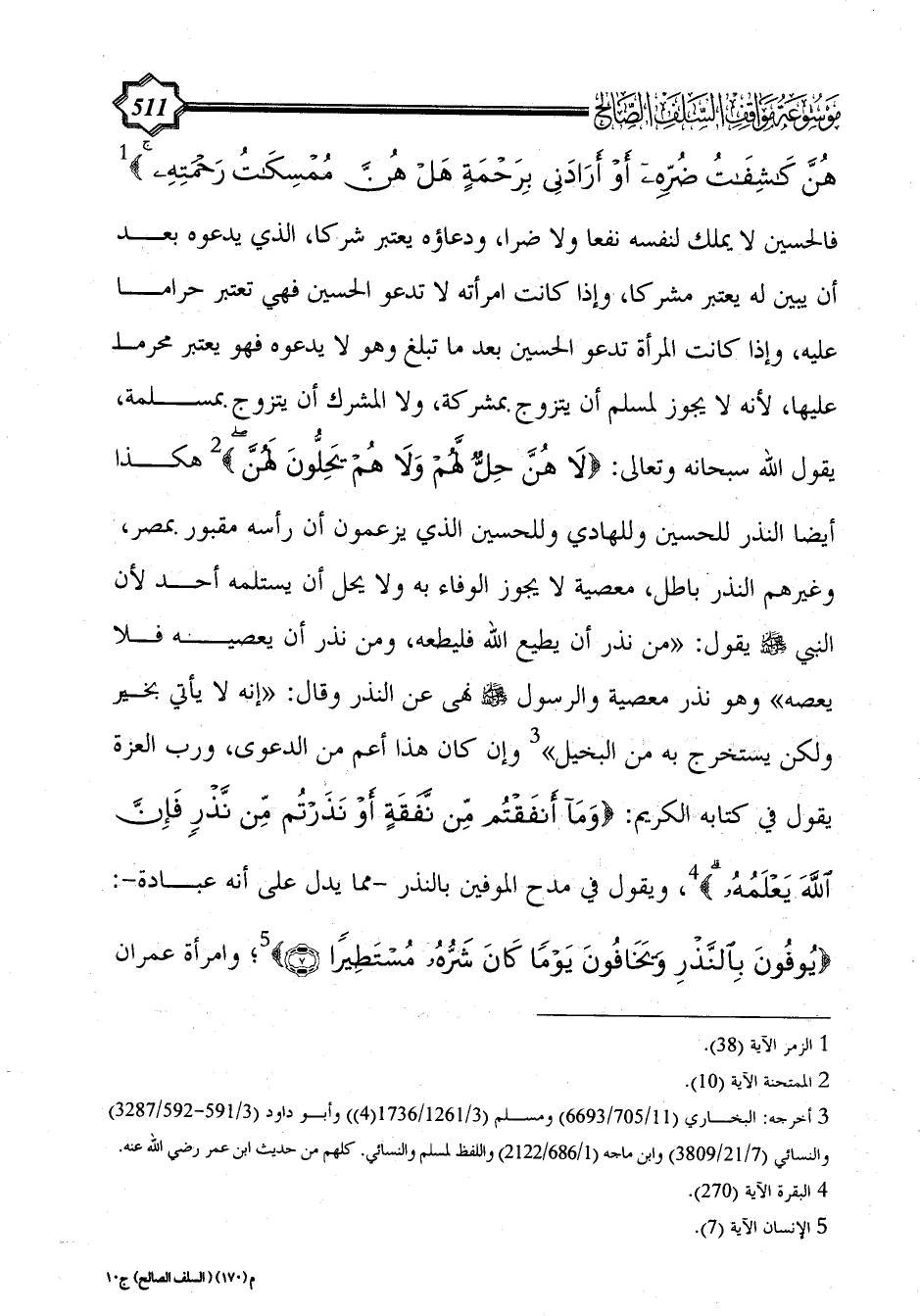 هُنَّ كَاشِفَاتُ ضُرِّهِ أَوْ أَرَادَنِي بِرَحْمَةٍ هَلْ هُنَّ مُمْسِكَاتُ رَحْمَتِهِ} (¬1) فالحسين لا يملك لنفسه نفعا ولا ضرا، ودعاؤه يعتبر شركا، الذي يدعوه بعد أن يبين له يعتبر مشركا، وإذا كانت امرأته لا تدعو الحسين فهي تعتبر حراما عليه، وإذا كانت المرأة تدعو الحسين بعد ما تبلغ وهو لا يدعوه فهو يعتبر محرما عليها، لأنه لا يجوز لمسلم أن يتزوج بمشركة، ولا المشرك أن يتزوج بمسلمة، يقول الله سبحانه وتعالى: {لَا هُنَّ حِلٌّ لَهُمْ وَلَا هُمْ يَحِلُّونَ لَهُنَّ} (¬2)