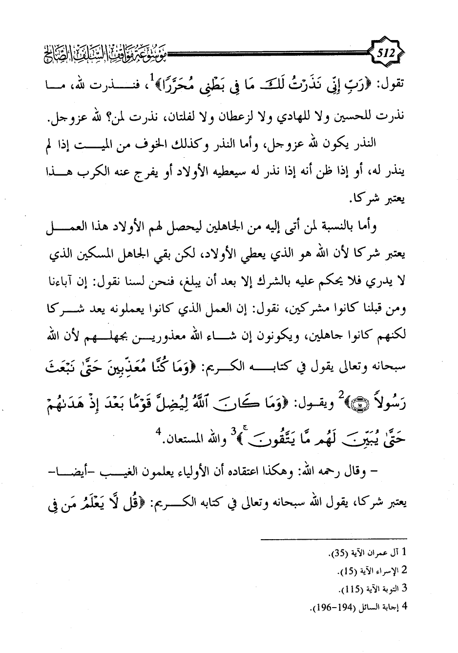 وأما بالنسبة لمن أتى إليه من الجاهلين ليحصل لهم الأولاد هذا العمل يعتبر شركا لأن الله هو الذي يعطي الأولاد، لكن بقي الجاهل المسكين الذي لا يدري فلا يحكم عليه بالشرك إلا بعد أن يبلغ، فنحن لسنا نقول: إن آباءنا ومن قبلنا كانوا مشركين، نقول: إن العمل الذي كانوا يعملونه يعد شركا لكنهم كانوا جاهلين، ويكونون إن شاء الله معذورين بجهلهم لأن الله سبحانه وتعالى يقول في كتابه الكريم: {وَمَا كُنَّا مُعَذِّبِينَ حَتَّى نَبْعَثَ رَسُولًا (15)} (¬2) ويقول: {وَمَا كَانَ اللَّهُ لِيُضِلَّ قَوْمًا بَعْدَ إِذْ هَدَاهُمْ حَتَّى يُبَيِّنَ لَهُمْ مَا يَتَّقُونَ} (¬3) والله المستعان. (¬4)