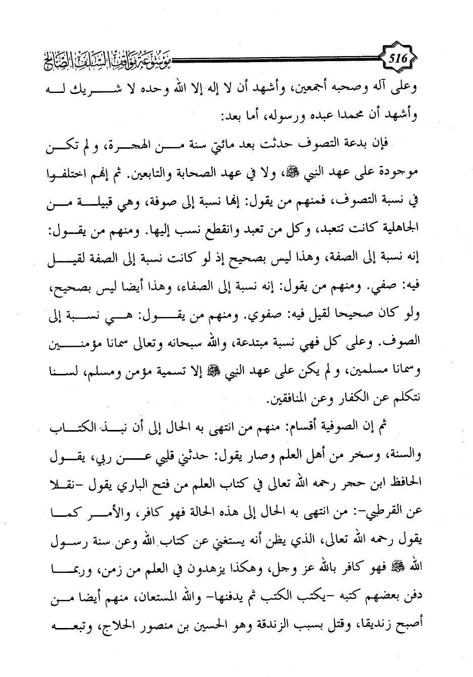ثم إن الصوفية أقسام: منهم من انتهى به الحال إلى أن نبذ الكتاب والسنة، وسخر من أهل العلم وصار يقول: حدثني قلبي عن ربي، يقول الحافظ ابن حجر رحمه الله تعالى في كتاب العلم من فتح الباري يقول -نقلا عن القرطبي-: من انتهى به الحال إلى هذه الحالة فهو كافر، والأمر كما يقول رحمه الله تعالى، الذي يظن أنه يستغني عن كتاب الله وعن سنة رسول الله - صلى الله عليه وسلم - فهو كافر بالله عز وجل، وهكذا يزهدون في العلم من زمن، وربما دفن بعضهم كتبه -يكتب الكتب ثم يدفنها- والله المستعان، منهم أيضا من أصبح زنديقا، وقتل بسبب الزندقة وهو الحسين بن منصور الحلاج، وتبعه