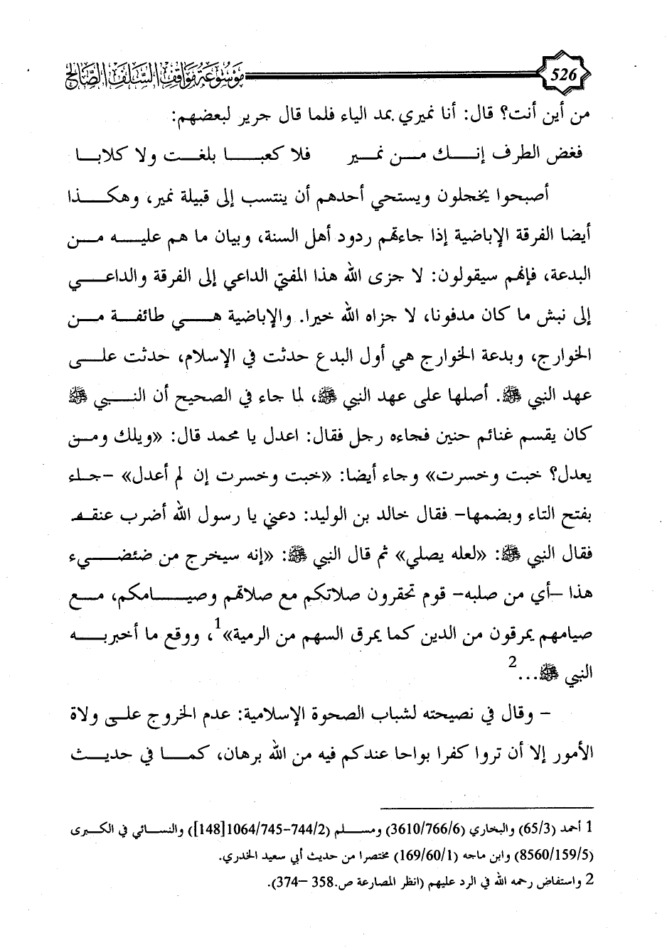 أصبحوا يخجلون ويستحي أحدهم أن ينتسب إلى قبيلة نمير، وهكذا أيضا الفرقة الإباضية إذا جاءتهم ردود أهل السنة، وبيان ما هم عليه من البدعة، فإنهم سيقولون: لا جزى الله هذا المفتي الداعي إلى الفرقة والداعي إلى نبش ما كان مدفونا، لا جزاه الله خيرا. والإباضية هي طائفة من الخوارج، وبدعة الخوارج هي أول البدع حدثت في الإسلام، حدثت على عهد النبي - صلى الله عليه وسلم -. أصلها على عهد النبي - صلى الله عليه وسلم -، لما جاء في الصحيح أن النبي - صلى الله عليه وسلم - كان يقسم غنائم حنين فجاءه رجل فقال: اعدل يا محمد قال: «ويلك ومن يعدل؟ خبت وخسرت» وجاء أيضا: «خبت وخسرت إن لم أعدل» -جاء بفتح التاء وبضمها- فقال خالد بن الوليد: دعني يا رسول الله أضرب عنقه. فقال النبي - صلى الله عليه وسلم -: «لعله يصلي» ثم قال النبي - صلى الله عليه وسلم -: «إنه سيخرج من ضئضيء هذا -أي من صلبه- قوم تحقرون صلاتكم مع صلاتهم وصيامكم، مع صيامهم يمرقون من الدين كما يمرق السهم من الرمية» (¬1)، ووقع ما أخبربه النبي - صلى الله عليه وسلم - ... (¬2)