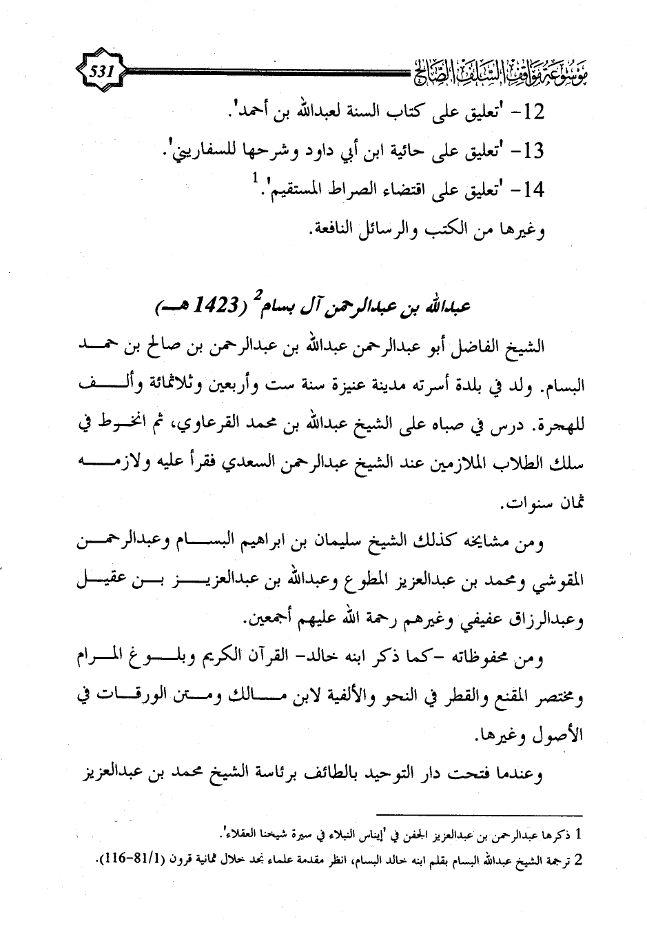 (¬2) ترجمة الشيخ عبد الله البسام بقلم ابنه خالد البسام، انظر مقدمة علماء نجد خلال ثمانية قرون (1/ 81 - 116).