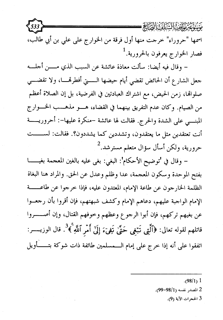 - وقال فيه أيضا: سألت معاذة عائشة عن السبب الذي من أجله جعل الشارع أن الحائض تقضي أيام حيضها التي أفطرتها، ولا تقضي صلواتها، زمن الحيض، مع اشتراك العبادتين في الفرضية، بل إن الصلاة أعظم من الصيام. وكان عدم التفريق بينهما في القضاء، هو مذهب الخوارج المبني على الشدة والحرج. فقالت لها عائشة -منكرة عليها-: أحرورية أنت تعتقدين مثل ما يعتقدون، وتشددين كما يشددون؟. فقالت: لست حرورية، ولكن أسأل سؤال متعلم مسترشد. (¬2)