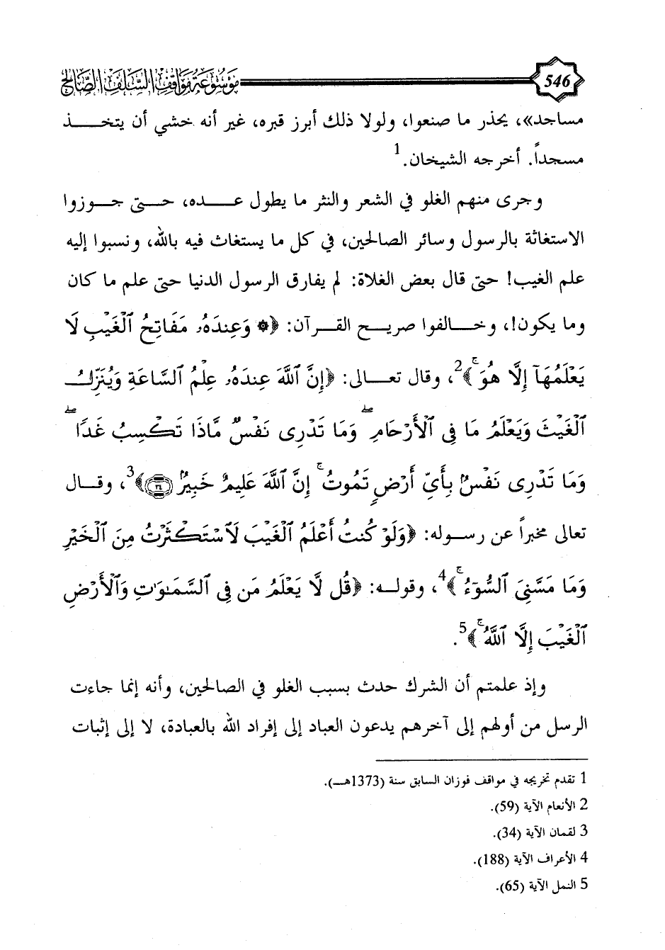 وجرى منهم الغلو في الشعر والنثر ما يطول عده، حتى جوزوا الاستغاثة بالرسول وسائر الصالحين، في كل ما يستغاث فيه بالله، ونسبوا إليه علم الغيب! حتى قال بعض الغلاة: لم يفارق الرسول الدنيا حتى علم ما كان وما يكون!، وخالفوا صريح القرآن: {* وَعِنْدَهُ مَفَاتِحُ الْغَيْبِ لَا يَعْلَمُهَا إِلَّا هُوَ} (¬2)، وقال تعالى: {إِنَّ اللَّهَ عِنْدَهُ عِلْمُ السَّاعَةِ وَيُنَزِّلُ الْغَيْثَ وَيَعْلَمُ مَا فِي الْأَرْحَامِ وَمَا تَدْرِي نَفْسٌ مَاذَا تَكْسِبُ غَدًا وَمَا تَدْرِي نَفْسٌ بِأَيِّ أَرْضٍ تَمُوتُ إِنَّ اللَّهَ عَلِيمٌ خَبِيرٌ (34)} (¬3)، وقال تعالى مخبراً عن رسوله: {وَلَوْ كُنْتُ أَعْلَمُ الْغَيْبَ لَاسْتَكْثَرْتُ مِنَ الْخَيْرِ وَمَا مَسَّنِيَ السُّوءُ} (¬4)، وقوله: {قُلْ لَا يَعْلَمُ مَنْ فِي السَّمَاوَاتِ وَالْأَرْضِ الْغَيْبَ إِلَّا اللَّهُ} (¬5).