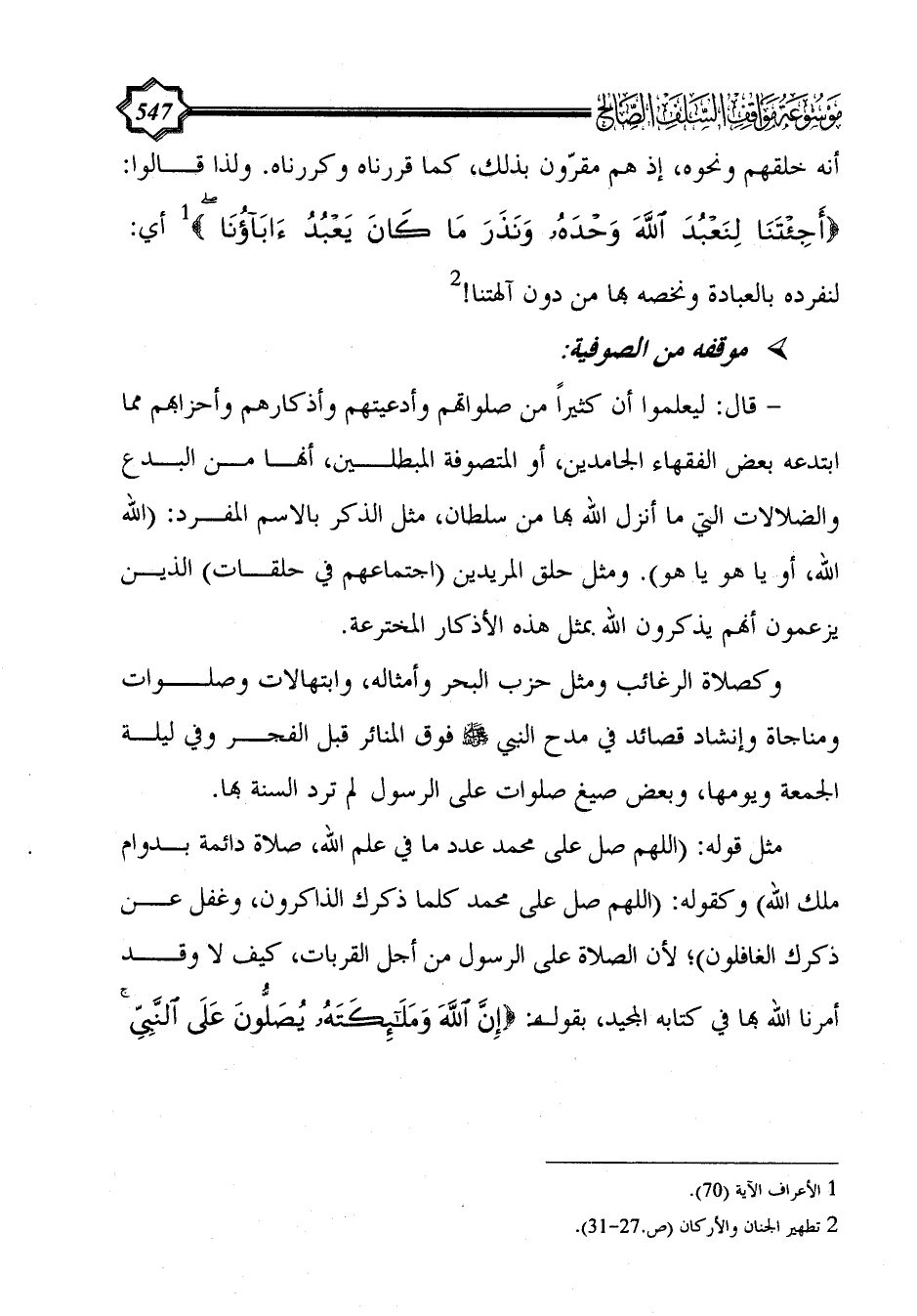 - قال: ليعلموا أن كثيراً من صلواتهم وأدعيتهم وأذكارهم وأحزابهم مما ابتدعه بعض الفقهاء الجامدين، أو المتصوفة المبطلين، أنها من البدع والضلالات التي ما أنزل الله بها من سلطان، مثل الذكر بالاسم المفرد: (الله الله، أو يا هو يا هو). ومثل حلق المريدين (اجتماعهم في حلقات) الذين يزعمون أنهم يذكرون الله بمثل هذه الأذكار المخترعة.