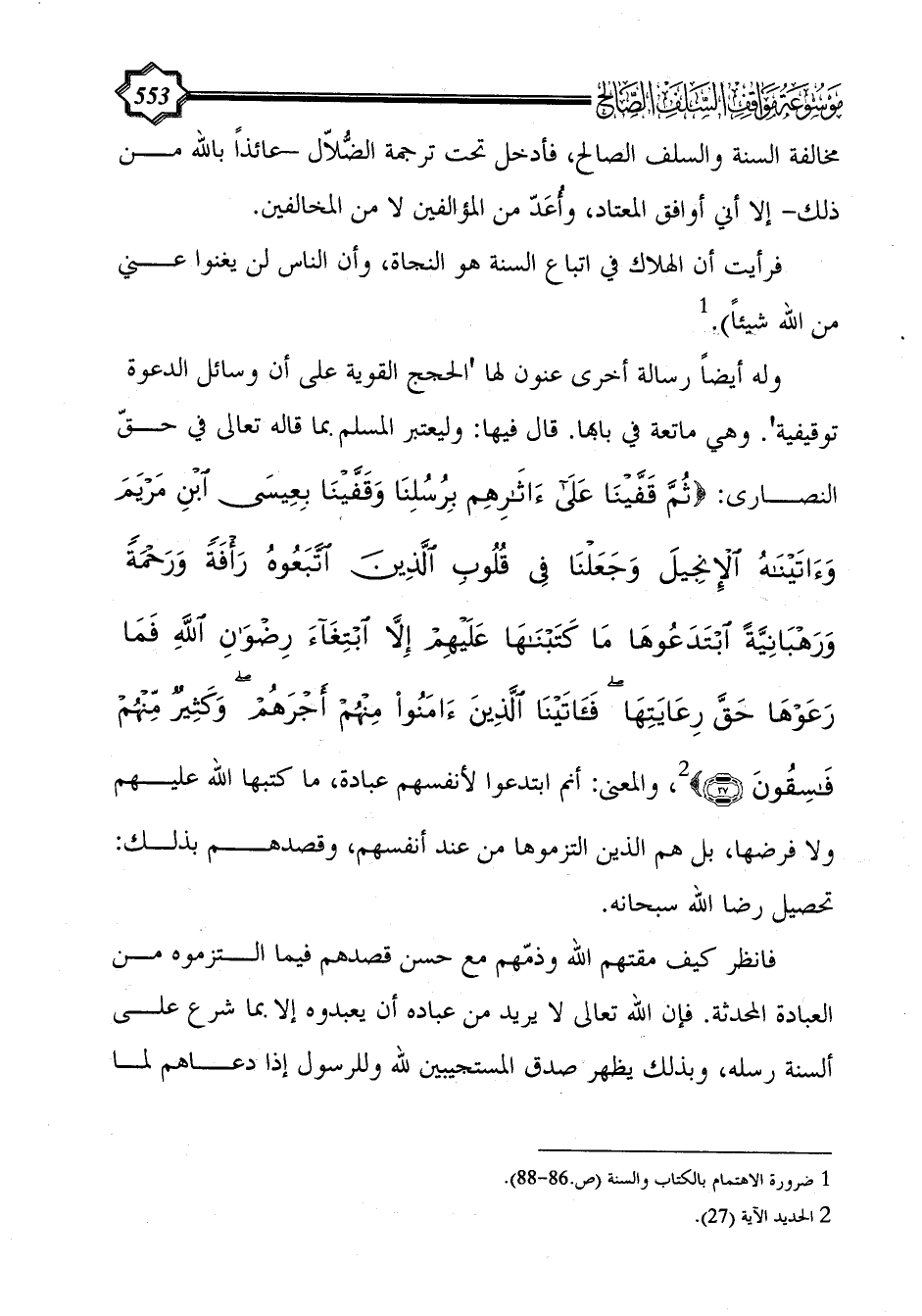 وله أيضاً رسالة أخرى عنون لها 'الحجج القوية على أن وسائل الدعوة توقيفية'. وهي ماتعة في بابها. قال فيها: وليعتبر المسلم بما قاله تعالى في حقّ النصارى: {ثُمَّ قَفَّيْنَا عَلَى آَثَارِهِمْ بِرُسُلِنَا وَقَفَّيْنَا بِعِيسَى ابْنِ مَرْيَمَ وَآَتَيْنَاهُ الْإِنْجِيلَ وَجَعَلْنَا فِي قُلُوبِ الَّذِينَ اتَّبَعُوهُ رَأْفَةً وَرَحْمَةً وَرَهْبَانِيَّةً ابْتَدَعُوهَا مَا كَتَبْنَاهَا عَلَيْهِمْ إِلَّا ابْتِغَاءَ رِضْوَانِ اللَّهِ فَمَا رَعَوْهَا حَقَّ رِعَايَتِهَا فَآَتَيْنَا الَّذِينَ آَمَنُوا مِنْهُمْ أَجْرَهُمْ وَكَثِيرٌ مِنْهُمْ فَاسِقُونَ (27)} (¬2)، والمعنى: أنم ابتدعوا لأنفسهم عبادة، ما كتبها الله عليهم ولا فرضها، بل هم الذين التزموها من عند أنفسهم، وقصدهم بذلك: تحصيل رضا الله سبحانه.