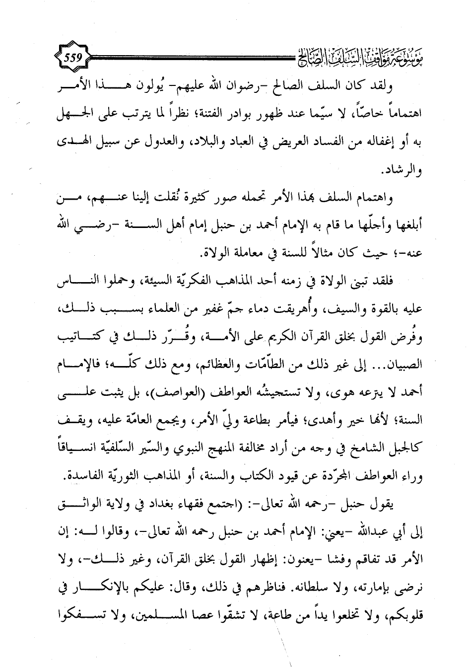 فلقد تبنى الولاة في زمنه أحد المذاهب الفكريّة السيئة، وحملوا الناس عليه بالقوة والسيف، وأُهريقت دماء جمّ غفير من العلماء بسبب ذلك، وفُرض القول بخلق القرآن الكريم على الأمة، وقُرّر ذلك في كتاتيب الصبيان ... إلى غير ذلك من الطاّمّات والعظائم، ومع ذلك كلّه؛ فالإمام أحمد لا ينزعه هوى، ولا تستجيشُه العواطف (العواصف)، بل يثبت على السنة؛ لأنها خير وأهدى؛ فيأمر بطاعة وليّ الأمر، ويجمع العامّة عليه، ويقف كالجبل الشامخ في وجه من أراد مخالفة المنهج النبوي والسّير السّلفيّة انسياقاً وراء العواطف المجرّدة عن قيود الكتاب والسنة، أو المذاهب الثوريّة الفاسدة.