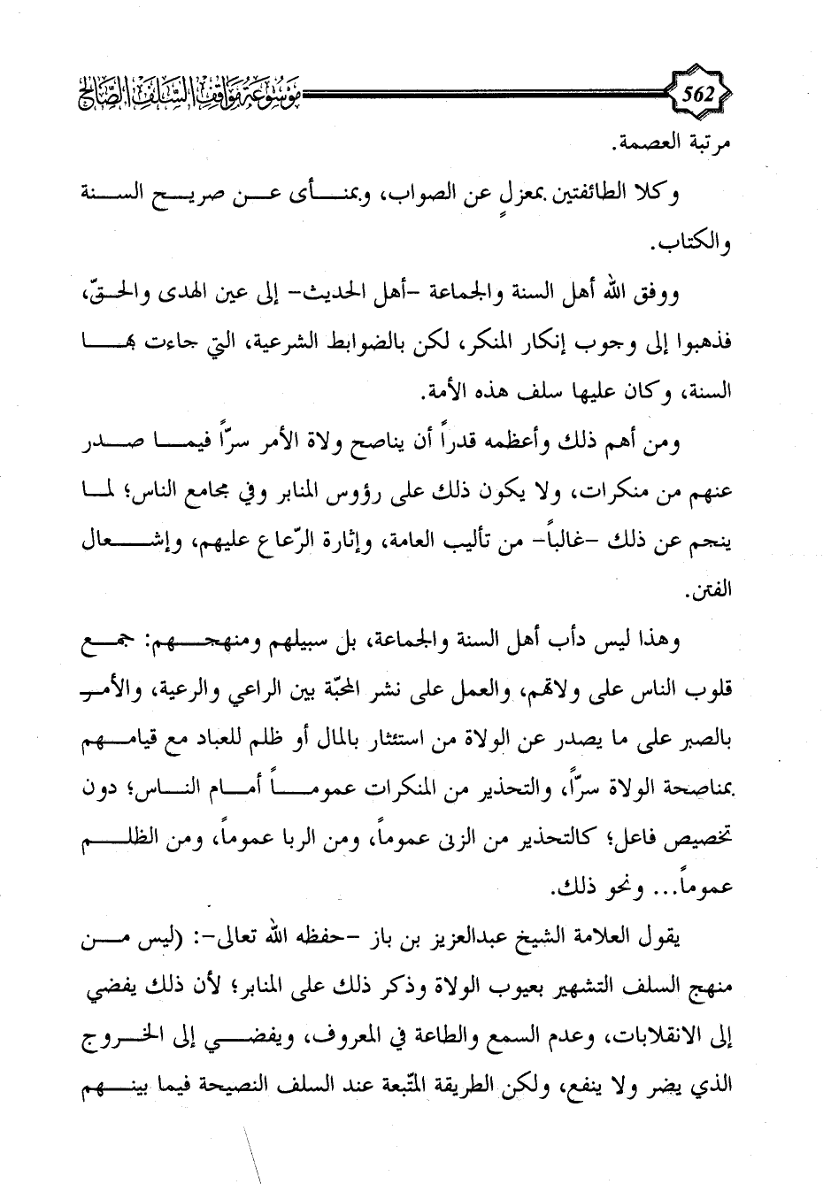 يقول العلامة الشيخ عبد العزيز بن باز -حفظه الله تعالى-: (ليس من منهج السلف التشهير بعيوب الولاة وذكر ذلك على المنابر؛ لأن ذلك يفضي إلى الانقلابات، وعدم السمع والطاعة في المعروف، ويفضي إلى الخروج الذي يضر ولا ينفع، ولكن الطريقة المتّبعة عند السلف النصيحة فيما بينهم