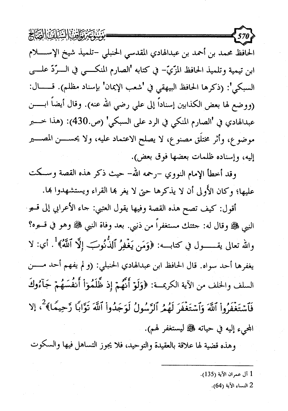 أقول: كيف تصح هذه القصة وفيها يقول العتبي: جاء الأعرابي إلى قبر النبي - صلى الله عليه وسلم - وقال له: جئتك مستغفراً من ذنبي. بعد وفاة النبي - صلى الله عليه وسلم - وهو في قبره؟ والله تعالى يقول في كتابه: {وَمَنْ يَغْفِرُ الذُّنُوبَ إِلَّا اللَّهُ} (¬1). أي: لا يغفرها أحد سواه. قال الحافظ ابن عبد الهادي الحنبلي: (ولم يفهم أحد من السلف والخلف من الآية الكريمة: {وَلَوْ أَنَّهُمْ إِذْ ظَلَمُوا أَنْفُسَهُمْ جَاءُوكَ فَاسْتَغْفَرُوا اللَّهَ وَاسْتَغْفَرَ لَهُمُ الرَّسُولُ لَوَجَدُوا اللَّهَ تَوَّابًا رَحِيمًا} (¬2)، إلا المجيء إليه في حياته - صلى الله عليه وسلم - ليستغفر لهم).