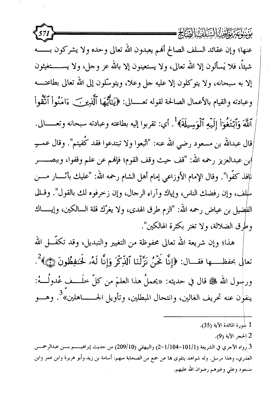 عنها؛ وإن عقائد السلف الصالح أنهم يعبدون الله تعالى وحده ولا يشركون به شيئاً، فلا يَسألون إلا الله تعالى، ولا يستعينون إلا بالله عز وجل، ولا يستغيثون إلا به سبحانه، ولا يتوكلون إلا عليه جل وعلا، ويتوسّلون إلى الله تعالى بطاعته وعبادته والقيام بالأعمال الصالحة لقوله تعالى: {يَا أَيُّهَا الَّذِينَ آَمَنُوا اتَّقُوا اللَّهَ وَابْتَغُوا إِلَيْهِ الْوَسِيلَةَ} (¬1). أي: تقربوا إليه بطاعته وعبادته سبحانه وتعالى. قال عبد الله بن مسعود رضي الله عنه: "اتّبعوا ولا تبتدعوا فقد كُفيتم". وقال عمر ابن عبد العزيز رحمه الله: "قف حيث وقف القوم؛ فإنهم عن علم وقفوا، وببصر نافذ كفّوا". وقال الإمام الأوزاعي إمام أهل الشام رحمه الله: "عليك بآثار من سلف، وإن رفضك الناس، وإياك وآراء الرجال، وإن زخرفوه لك بالقول". وقال الفضيل بن عياض رحمه الله: "الزم طرق الهدى، ولا يغرّك قلة السالكين، وإياك وطرق الضلالة، ولا تغتر بكثرة الهالكين".