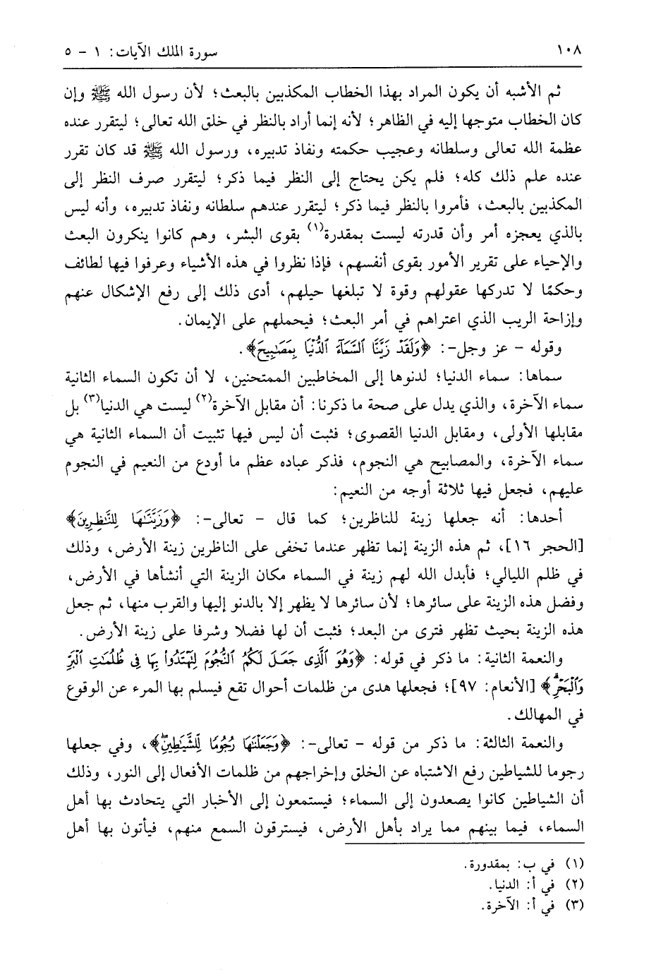 سماها: سماء الدنيا؛ لدنوها إلى المخاطبين الممتحنين، لا أن تكون السماء الثانية سماء الآخرة، والذي يدل على صحة ما ذكرنا: أن مقابل الآخرة ليست هي الدنيا بل مقابلها الأولى، ومقابل الدنيا القصوى؛ فثبت أن ليس فيها تثبيت أن السماء الثانية هي سماء الآخرة، والمصابيح هي النجوم، فذكر عباده عظم ما أودع من النعيم في النجوم عليهم، فجعل فيها ثلاثة أوجه من النعيم: