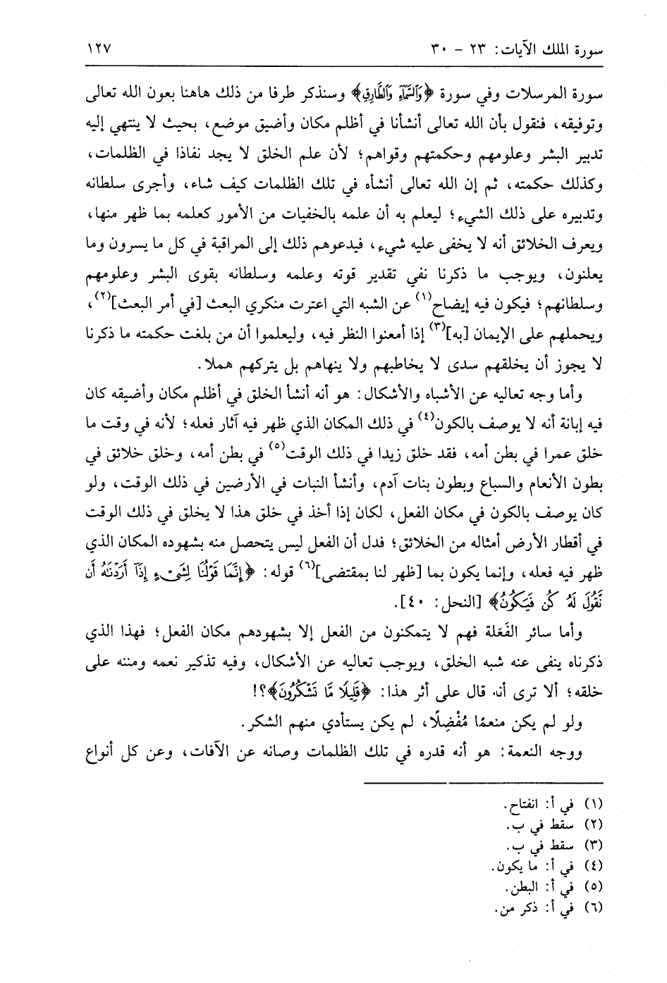 سورة المرسلات وفي سورة (وَالسَّمَاءِ وَالطَّارِقِ) وسنذكر طرفا من ذلك هاهنا بعون اللَّه تعالى وتوفيقه، فنقول بأن اللَّه تعالى أنشأنا في أظلم مكان وأضيق موضع، بحيث لا ينتهي إليه تدبير البشر وعلومهم وحكمتهم وقواهم؛ لأن علم الخلق لا يجد نفاذا في الظلمات، وكذلك حكمته، ثم إن اللَّه تعالى أنشأه في تلك الظلمات كيف شاء، وأجرى سلطانه وتدبيره على ذلك الشيء؛ ليعلم به أن علمه بالخفيات من الأمور كعلمه بما ظهر منها، ويعرف الخلائق أنه لا يخفى عليه شيء، فيدعوهم ذلك إلى المراقبة في كل ما يسرون وما يعلنون، ويوجب ما ذكرنا نفي تقدير قوته وعلمه وسلطانه بقوى البشر وعلومهم وسلطانهم؛ فيكون فيه إيضاح عن الشبه التي اعترت منكري البعث في أمر البعث، ويحملهم على الإيمان به إذا أمعنوا النظر فيه، وليعلموا أن من بلغت حكمته ما ذكرنا لا يجوز أن يخلقهم سدى لا يخاطبهم ولا ينهاهم بل يتركهم هملا.