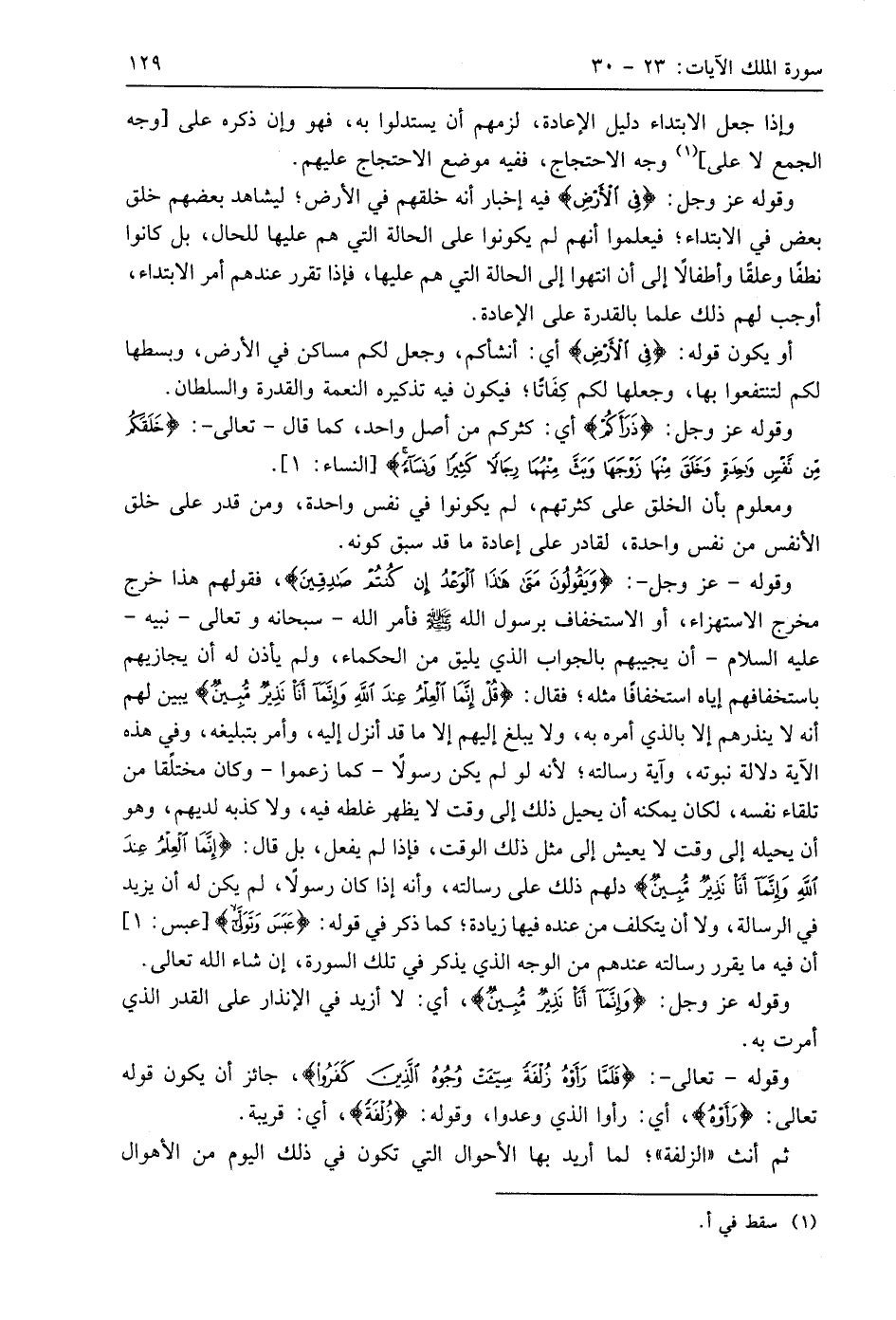 وقوله - تعالى -: (فَلَمَّا رَأَوْهُ زُلْفَةً سِيئَتْ وُجُوهُ الَّذِينَ كَفَرُوا وَقِيلَ هَذَا الَّذِي كُنْتُمْ بِهِ تَدَّعُونَ (27) جائز أن يكون قوله تعالى: (رَأَوْهُ)، أي: رأوا الذي وعدوا، وقوله: (زُلْفَةً)، أي: قريبة.