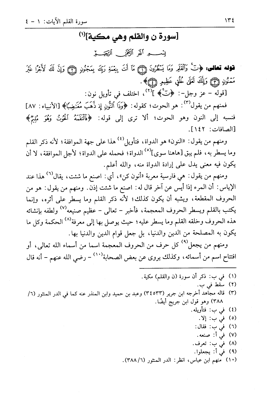 ومنهم من يقول: هي فارسية معربة " أنون كن "، أي: اصنع ما شئت، يقال هذا عند الإياس: أن المرء إذا أيس عن آخر قال له: اصنع ما شئت إذن. ومنهم من يقول: هو من الحروف المقطعة، ويشبه أن يكون كذلك؛ لأنه ذكر القلم وما يسطر على أثره، وإنما يكتب بالقلم ويسطر الحروف المعجمة، فأخبر - تعالى - عظيم صنيعه ولطفه بإنشائه هذه الحروف وخلقه القلم وما يسطر عليه؛ حيث يوصل بها إلى معرفة الحكمة وكل ما يكون به المصلحة من الدِّين والدنيا، بل جعل قوام الدِّين والدنيا بها.