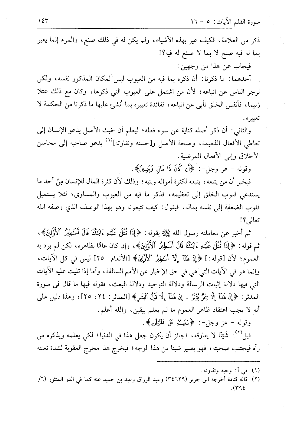 فيخبر أن من يتبعه، يتبعه لكثرة أمواله وبنيه؛ وذلك لأن كثرة المال للإنسان مِن أحد ما يستدعي قلوب الخلق إلى تعظيمه، فذكر ما فيه من العيوب والمساوئ؛ لئلا يستميل قلوب الضعفة إلى نفسه بماله، فيقول: كيف تتبعونه وهو بهذا الوصف الذي وصفه الله تعالى؟!