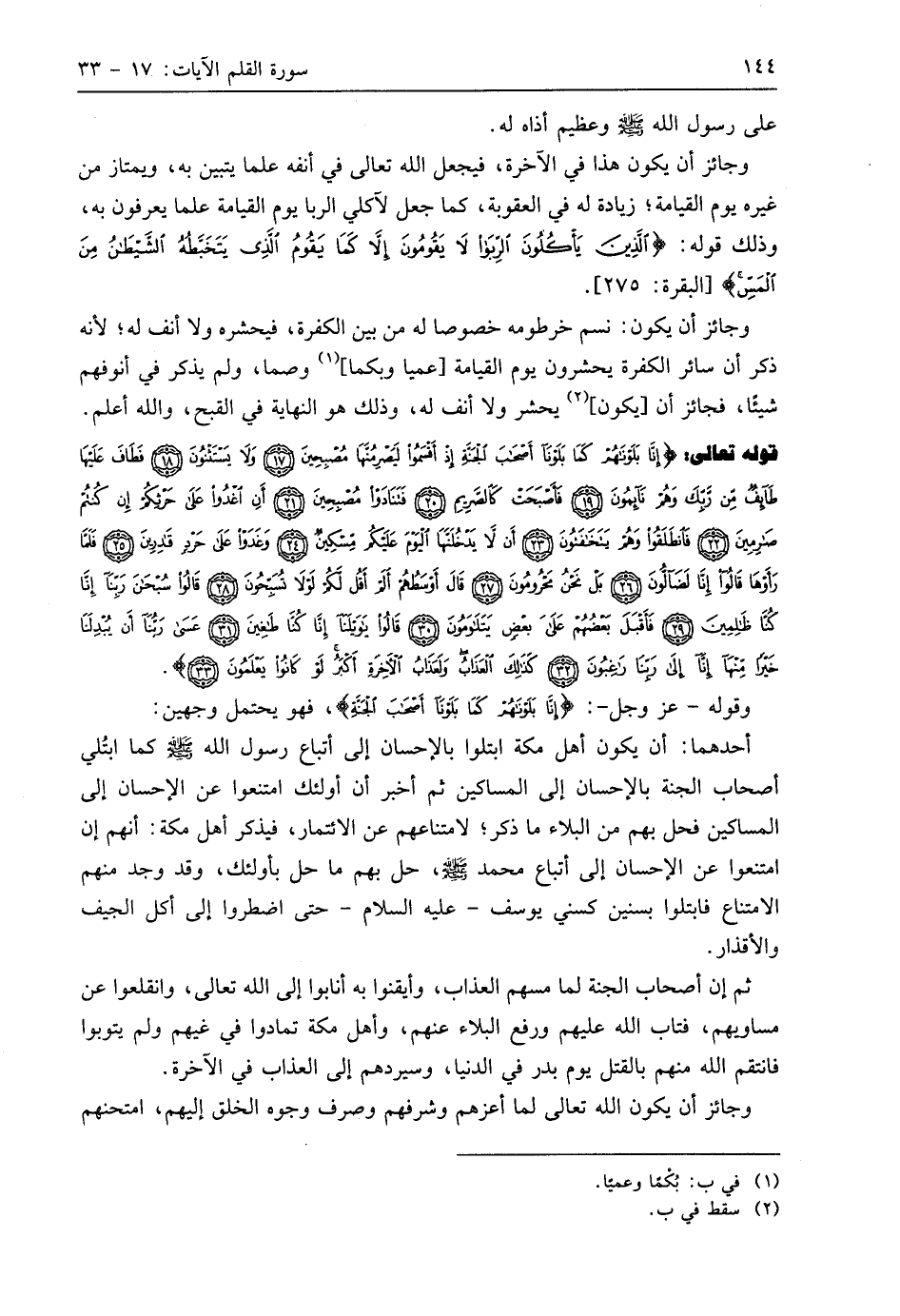 وقوله - عَزَّ وَجَلَّ -: (إِنَّا بَلَوْنَاهُمْ كَمَا بَلَوْنَا أَصْحَابَ الْجَنَّةِ)، فهو يحتمل وجهين:
