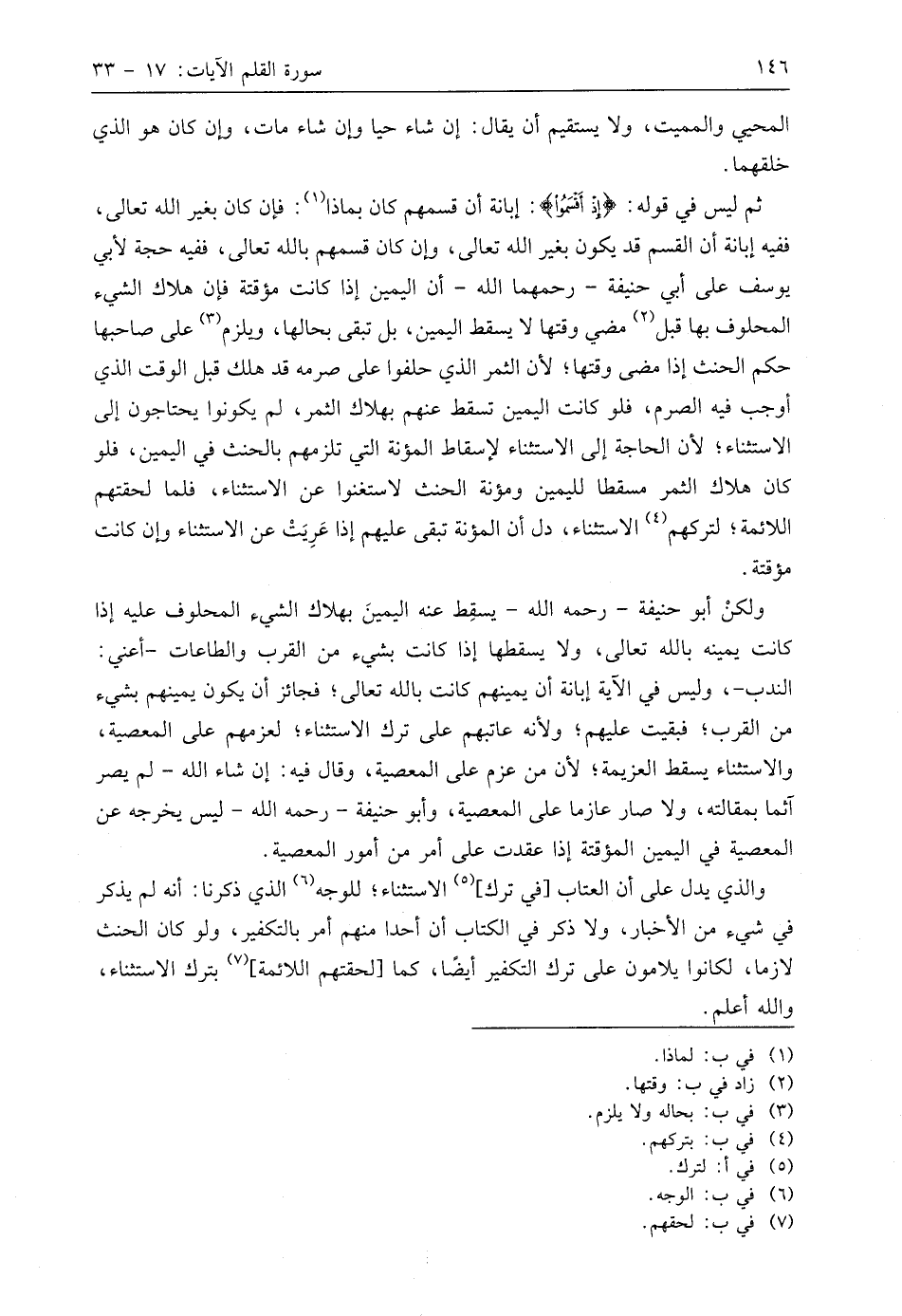 ولكن أبو حنيفة - رحمه اللَّه - يسقِط عنه اليمينَ بهلاك الشيء المحلوف عليه إذا كانت يمينه باللَّه تعالى، ولا يسقطها إذا كانت بشيء من القرب والطاعات -أعني: الندب-، وليس في الآية إبانة أن يمينهم كانت باللَّه تعالى؛ فجائز أن يكون يمينهم بشيء من القرب؛ فبقيت عليهم؛ ولأنه عاتبهم على ترك الاستثناء؛ لعزمهم على المعصية، والاستثناء يسقط العزيمة؛ لأن من عزم على المعصية، وقال فيه: إن شاء اللَّه - لم يصر آثما بمقالته، ولا صار عازما على المعصية، وأبو حنيفة - رحمه اللَّه - ليس يخرجه عن المعصية في اليمين المؤقتة إذا عقدت على أمر من أمور المعصية.