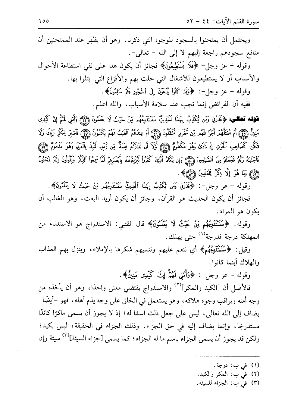 وقوله: (سَنَسْتَدْرِجُهُمْ مِنْ حَيْثُ لَا يَعْلَمُونَ) قَالَ الْقُتَبِيُّ: الاستدراج هو الاستدناء من المهلكة درجة فدرجة حتى يهلك.