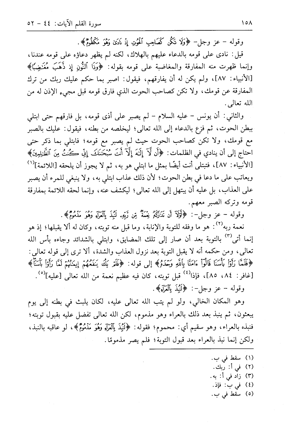 والثاني: أن يونس - عليه السلام - لم يصبر على أذى قومه، بل فارقهم حتى ابتلي ببطن الحوت، ثم فزع بالدعاء إلى اللَّه تعالى؛ ليخلصه من بطنه، فيقول: عليك بالصبر مع قومك، ولا تكن كصاحب الحوت حيث لم يصبر مع قومه؛ فابتلي بما ذكر حتى احتاج إلى أن ينادى في الظلمات: (أَنْ لَا إِلَهَ إِلَّا أَنْتَ سُبْحَانَكَ إِنِّي كُنْتُ مِنَ الظَّالِمِينَ)، فتبتلى أنت أيضًا بمثل ما ابتلي هو به، ثم لا يجوز أن يلحقه اللائمة ويعاتب على ما دعا في بطن الحوت؛ لأن ذلك عذاب ابتلي به، ولا ينبغي للمرء أن يصبر على العذاب، بل عليه أن يبتهل إلى اللَّه تعالى؛ ليكشف عنه، وإنَّمَا لحقه اللائمة بمفارقة قومه وتركه الصبر معهم.