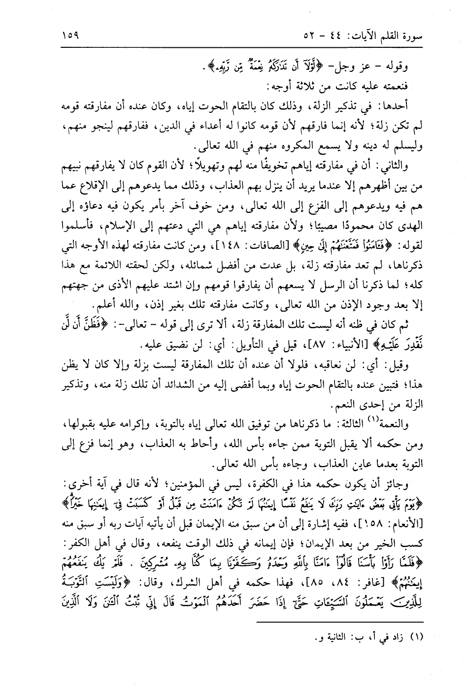 والثاني: أن في مفارقته إياهم تخويفًا منه لهم وتهويلاً؛ لأن القوم كان لا يفارقهم نبيهم من بين أظهرهم إلا عندما يريد أن ينزل بهم العذاب، وذلك مما يدعوهم إلى الإقلاع عما هم فيه ويدعوهم إلى الفزع إلى اللَّه تعالى، ومن خوف آخر بأمر يكون فيه دعاؤه إلى الهدى كان محمودًا مصيبًا؛ ولأن مفارقته إياهم هي التي دعتهم إلى الإسلام، فأسلموا لقوله: (فَآمَنُوا فَمَتَّعْنَاهُمْ إِلَى حِينٍ)، ومن كانت مفارقته لهذه الأوجه التي ذكرناها، لم تعد مفارقته زلة، بل عدت من أفضل شمائله، ولكن لحقته اللائمة مع هذا كله؛ لما ذكرنا أن الرسل لا يسعهم أن يفارقوا قومهم وإن اشتد عليهم الأذى من جهتهم إلا بعد وجود الإذن من اللَّه تعالى، وكانت مفارقته تلك بغير إذن، واللَّه أعلم.