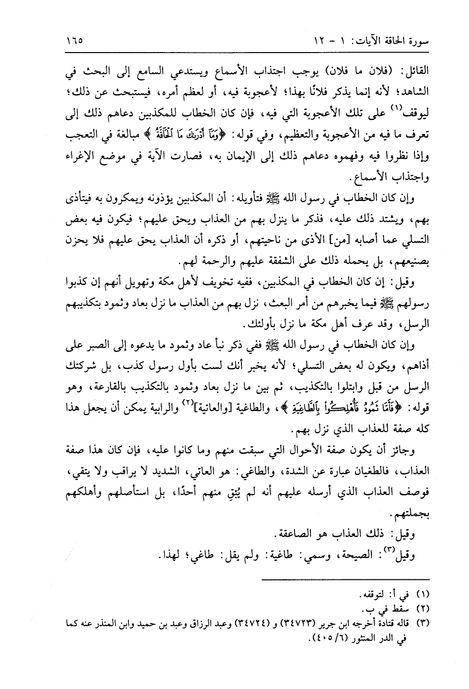 وإِن كان الخطاب في رسول اللَّه - صَلَّى اللَّهُ عَلَيهِ وَسَلَّمَ - ففي ذكر نبأ عاد وثمود ما يدعوه إلى الصبر على أذاهم، ويكون له بعض التسلي؛ لأنه يخبر أنك لست بأول رسول كذب، بل شركتك الرسل من قبل وابتلوا بالتكذيب، ثم بين ما نزل بعاد وثمود بالتكذيب بالقارعة، وهو قوله: (فَأَمَّا ثَمُودُ فَأُهْلِكُوا بِالطَّاغِيَةِ (5) والطاغية والعاتية والرابية يمكن أن يجعل هذا كله صفة للعذاب الذي نزل بهم.