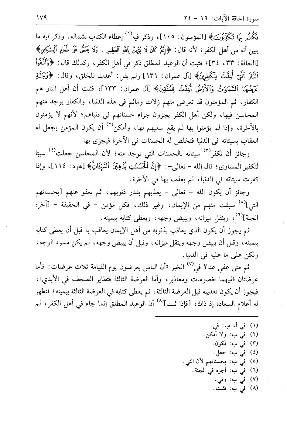فَكُنْتُمْ بِهَا تُكَذِّبُونَ)، وذكر فيه إعطاء الكتاب بشماله، وذكر فيه ما يبين أنه من أهل الكفر؛ لأنه قال: (إِنَّهُ كَانَ لَا يُؤْمِنُ بِاللَّهِ الْعَظِيمِ. وَلَا يَحُضُّ عَلَى طَعَامِ الْمِسْكِينِ)؛ فثبت أن الوعيد المطلق ذكر في أهل الكفر، وكذلك قال: (وَاتَّقُوا النَّارَ الَّتِي أُعِدَّتْ لِلْكَافِرِينَ)، ولم يقل: أعدت للخلق، وقال: (وَجَنَّةٍ عَرْضُهَا السَّمَاوَاتُ وَالْأَرْضُ أُعِدَّتْ لِلْمُتَّقِينَ)؛ فثبت أن أهل النار هم الكفار، ثم المؤمنون قد تعرض منهم زلات ومآثم في هذه الدنيا، والكفار يوجد منهم المحاسن فيها، ولكن أهل الكفر يجزون جزاء حسناتهم في دنياهم؛ لأنهم لا يؤمنون بالآخرة، وإذا لم يؤمنوا بها لم يقع سعيهم لها، وأمكن أن يكون المؤمن يجعل له العقاب بسيئاته في الدنيا فتخلص له الحسنات في الآخرة فيجزى بها.