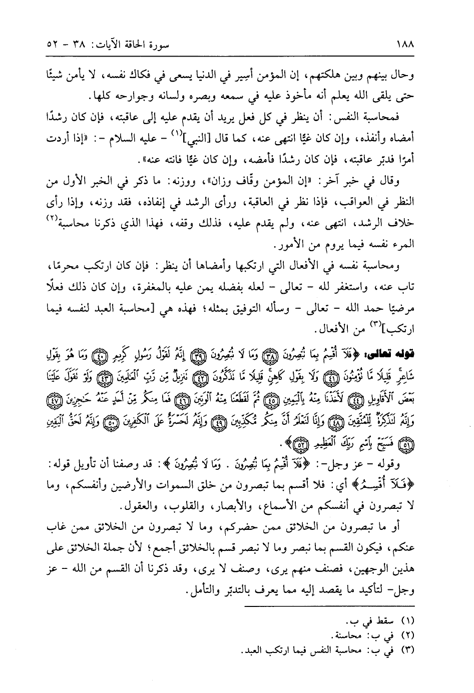 قوله تعالى: (فَلَا أُقْسِمُ بِمَا تُبْصِرُونَ (38) وَمَا لَا تُبْصِرُونَ (39) إِنَّهُ لَقَوْلُ رَسُولٍ كَرِيمٍ (40) وَمَا هُوَ بِقَوْلِ شَاعِرٍ قَلِيلًا مَا تُؤْمِنُونَ (41) وَلَا بِقَوْلِ كَاهِنٍ قَلِيلًا مَا تَذَكَّرُونَ (42) تَنْزِيلٌ مِنْ رَبِّ الْعَالَمِينَ (43) وَلَوْ تَقَوَّلَ عَلَيْنَا بَعْضَ الْأَقَاوِيلِ (44) لَأَخَذْنَا مِنْهُ بِالْيَمِينِ (45) ثُمَّ لَقَطَعْنَا مِنْهُ الْوَتِينَ (46) فَمَا مِنْكُمْ مِنْ أَحَدٍ عَنْهُ حَاجِزِينَ (47) وَإِنَّهُ لَتَذْكِرَةٌ لِلْمُتَّقِينَ (48) وَإِنَّا لَنَعْلَمُ أَنَّ مِنْكُمْ مُكَذِّبِينَ (49) وَإِنَّهُ لَحَسْرَةٌ عَلَى الْكَافِرِينَ (50) وَإِنَّهُ لَحَقُّ الْيَقِينِ (51) فَسَبِّحْ بِاسْمِ رَبِّكَ الْعَظِيمِ (52).