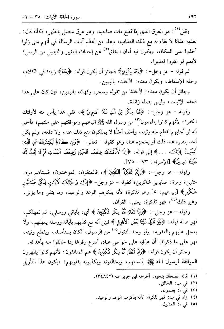 ثم قوله - عَزَّ وَجَلَّ -: (مِنْهُ بِالْيَمِينِ) فجائز أن يكون قوله: (مِنْهُ) زيادة في الكلام، وحقه الإسقاط، ويكون معناه: لأخذناه باليمين.