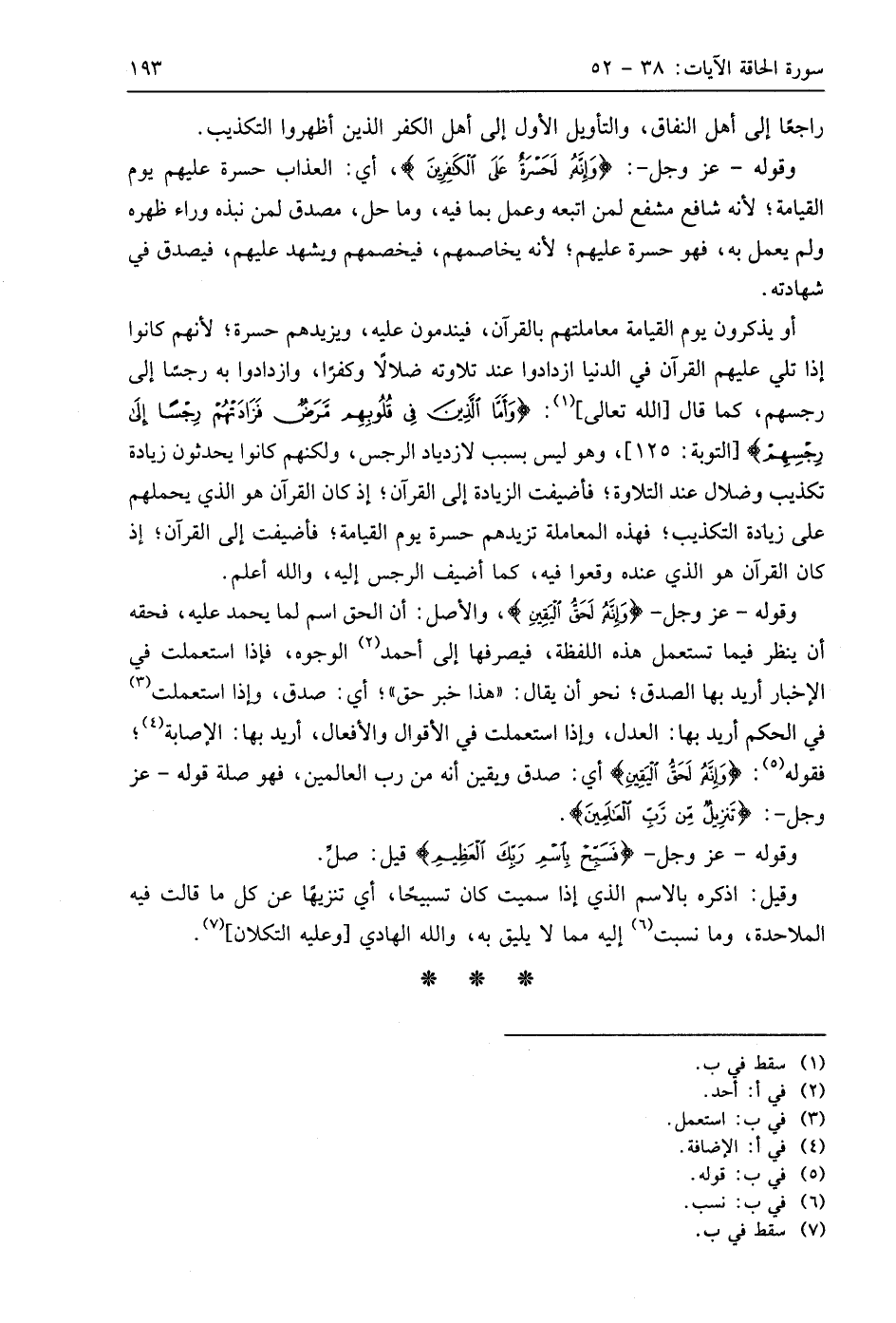 وقوله - عَزَّ وَجَلَّ - (وَإِنَّهُ لَحَقُّ الْيَقِينِ (51) والأصل: أن الحق اسم لما يحمد عليه، فحقه أن ينظر فيما تستعمل هذه اللفظة، فيصرفها إلى أحمد الوجوه، فإذا استعملت في الإخبار أريد بها الصدق؛ نحو أن يقال: " هذا خبر حق "؛ أي: صدق، وإذا استعملت في الحكم أريد بها: العدل، وإذا استعملت في الأقوال والأفعال، أريد بها: الإصابة؛ فقوله: (وَإِنَّهُ لَحَقُّ الْيَقِينِ) أي: صدق ويقين أنه من رب العالمين، فهو صلة قوله - عز وجل -: (تَنْزِيلٌ مِنْ رَبِّ الْعَالَمِينَ).