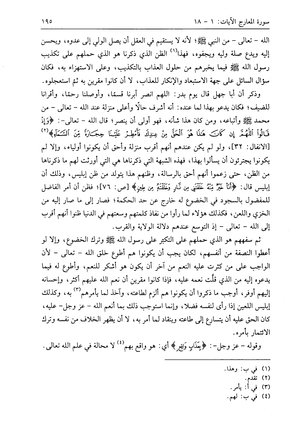 وذكر أن أبا جهل قال يوم بدر: اللهم انصر أبرنا قسمًا، وأوصلنا رحمًا، وأقرانا للضيف؛ فكان يدعو بهذا لما عنده: أنه أشرف حالًا وأعلى منزلة عند اللَّه - تعالى - من مُحَمَّد - صَلَّى اللَّهُ عَلَيهِ وَسَلَّمَ - وأتباعه، ومن كان هذا شأنه، فهو أولى أن ينصر؛ قال اللَّه - تعالى -: (وَإِذْ قَالُوا اللَّهُمَّ إِنْ كَانَ هَذَا هُوَ الْحَقَّ مِنْ عِنْدِكَ فَأَمْطِرْ عَلَيْنَا حِجَارَةً مِنَ السَّمَاءِ)، ولو لم يكن عندهم أنهم أقرب منزلة وأحق أن يكونوا أولياء، وإلا لم يكونوا يجترئون أن يسألوا بهذا، فهذه الشبهة التي ذكرناها هي التي أورثت لهم ما ذكرناها من الظن، حتى زعموا أنهم أحق بالرسالة، وظنهم هذا يتولد من ظن إبليس، وذلك أن إبليس قال: (أَنَا خَيْرٌ مِنْهُ خَلَقْتَنِي مِنْ نَارٍ وَخَلَقْتَهُ مِنْ طِينٍ)؛ فظن أن أمر الفاضل للمفضول بالسجود في الخضوع له خارج عن حد الحكمة؛ فصار إلى ما صار إليه من الخزي واللعن، فكذلك هَؤُلَاءِ لما رأوا من نفاذ كلمتهم وسعتهم في الدنيا ظنوا أنهم أقرب إلى اللَّه - تعالى - إذ التوسع عندهم دلالة الولاية والقرب.