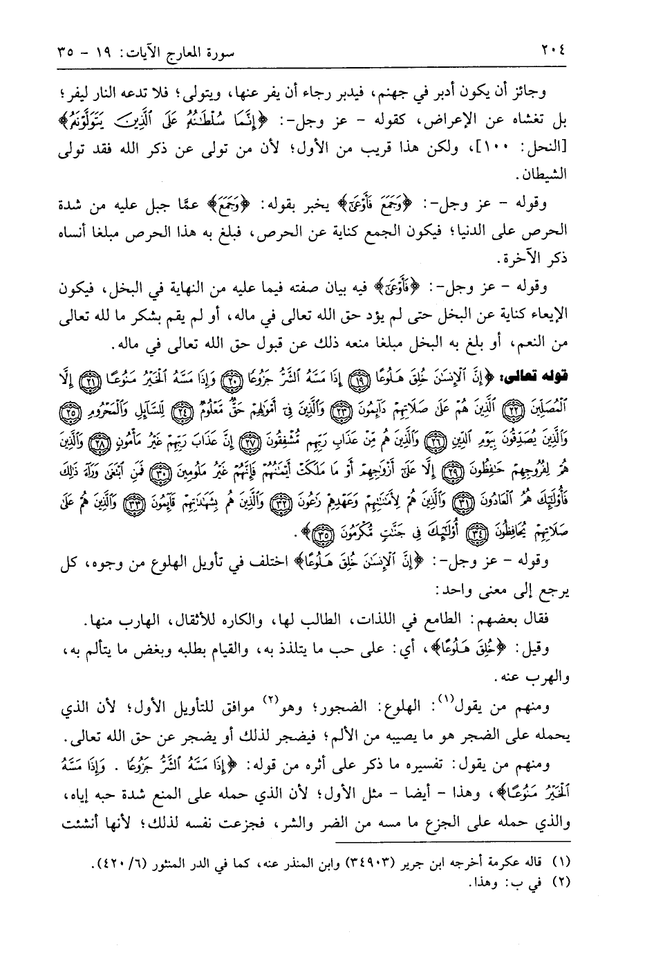 قوله تعالى: (إِنَّ الْإِنْسَانَ خُلِقَ هَلُوعًا (19) إِذَا مَسَّهُ الشَّرُّ جَزُوعًا. وَإِذَا مَسَّهُ الْخَيْرُ مَنُوعًا. إِلَّا الْمُصَلِّينَ (22) الَّذِينَ هُمْ عَلَى صَلَاتِهِمْ دَائِمُونَ (23) وَالَّذِينَ فِي أَمْوَالِهِمْ حَقٌّ مَعْلُومٌ (24) لِلسَّائِلِ وَالْمَحْرُومِ (25) وَالَّذِينَ يُصَدِّقُونَ بِيَوْمِ الدِّينِ (26) وَالَّذِينَ هُمْ مِنْ عَذَابِ رَبِّهِمْ مُشْفِقُونَ (27) إِنَّ عَذَابَ رَبِّهِمْ غَيْرُ مَأْمُونٍ (28) وَالَّذِينَ هُمْ لِفُرُوجِهِمْ حَافِظُونَ (29) إِلَّا عَلَى أَزْوَاجِهِمْ أَوْ مَا مَلَكَتْ أَيْمَانُهُمْ فَإِنَّهُمْ غَيْرُ مَلُومِينَ (30) فَمَنِ ابْتَغَى وَرَاءَ ذَلِكَ فَأُولَئِكَ هُمُ الْعَادُونَ (31) وَالَّذِينَ هُمْ لِأَمَانَاتِهِمْ وَعَهْدِهِمْ رَاعُونَ (32) وَالَّذِينَ هُمْ بِشَهَادَاتِهِمْ قَائِمُونَ (33) وَالَّذِينَ هُمْ عَلَى صَلَاتِهِمْ يُحَافِظُونَ (34) أُولَئِكَ فِي جَنَّاتٍ مُكْرَمُونَ (35).