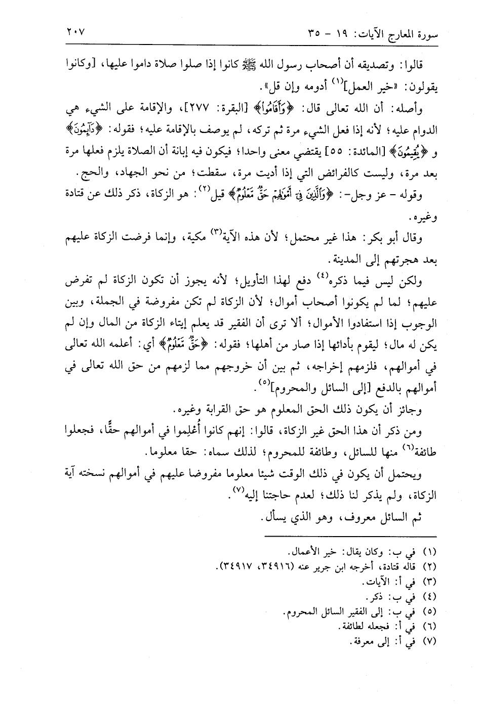 ولكن ليس فيما ذكره دفع لهذا التأويل؛ لأنه يجوز أن تكون الزكاة لم تفرض عليهم؛ لما لم يكونوا أصحاب أموال؛ لأن الزكاة لم تكن مفروضة في الجملة، وبين الوجوب إذا استفادوا الأموال؛ ألا ترى أن الفقير قد يعلم إيتاء الزكاة من المال وإن لم يكن له مال؛ ليقوم بأدائها إذا صار من أهلها؛ فقوله: (حَقٌّ مَعْلُومٌ) أي: أعلمه اللَّه تعالى في أموالهم، فلزمهم إخراجه، ثم بين أن خروجهم مما لزمهم من حق اللَّه تعالى في أموالهم بالدفع إلى السائل والمحروم.