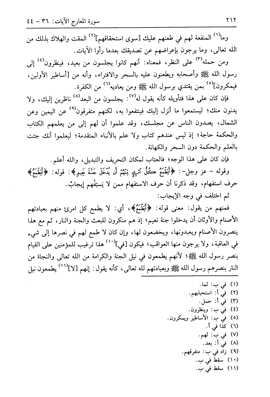 فمنهم من يقول: معنى قوله: (أَيَطْمَعُ)، أي: لا يطمع كل امرئ منهم بعبادتهم الأصنام والأوثان أن يدخلوا جنة نعيم؛ إذ هم منكرون للبعث والجنة والنار، ثم مع هذا ينصرون الأصنام ويعبدونها، ويخضعون لها، وإن كان لا طمع لهم في نصرها إلى شيء في العاقبة، ولا يرجون منها العواقب؛ فيكون في هذا ترغيب للمؤمنين على القيام بنصر رسول اللَّه - صَلَّى اللَّهُ عَلَيهِ وَسَلَّمَ -؛ لأنهم يطمعون في نيل الجنة والكرامة من اللَّه تعالى والنجاة من النار بنصرهم رسول اللَّه - صَلَّى اللَّهُ عَلَيهِ وَسَلَّمَ - وبعبادتهم لله تعالى، كأنه يقول: إنهم لا يطمعون نيل