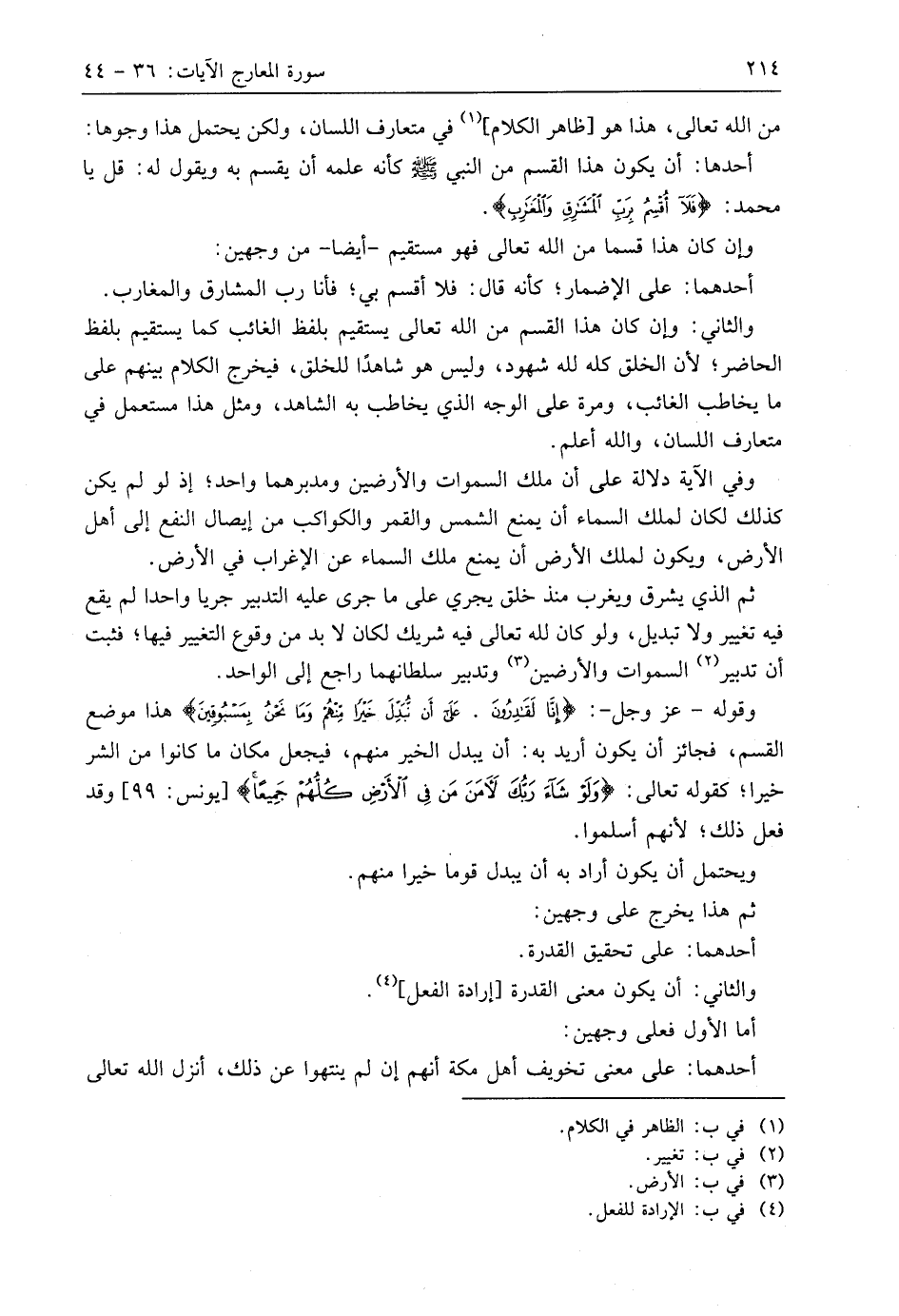 وقوله - عَزَّ وَجَلَّ -: (إِنَّا لَقَادِرُونَ (40) عَلَى أَنْ نُبَدِّلَ خَيْرًا مِنْهُمْ وَمَا نَحْنُ بِمَسْبُوقِينَ (41) هذا موضع القسم، فجائز أن يكون أريد به: أن يبدل الخير منهم، فيجعل مكان ما كانوا من الشر خيرا؛ كقوله تعالى: (وَلَوْ شَاءَ رَبُّكَ لَآمَنَ مَنْ فِي الْأَرْضِ كُلُّهُمْ جَمِيعًا)، وقد فعل ذلك؛ لأنهم أسلموا.