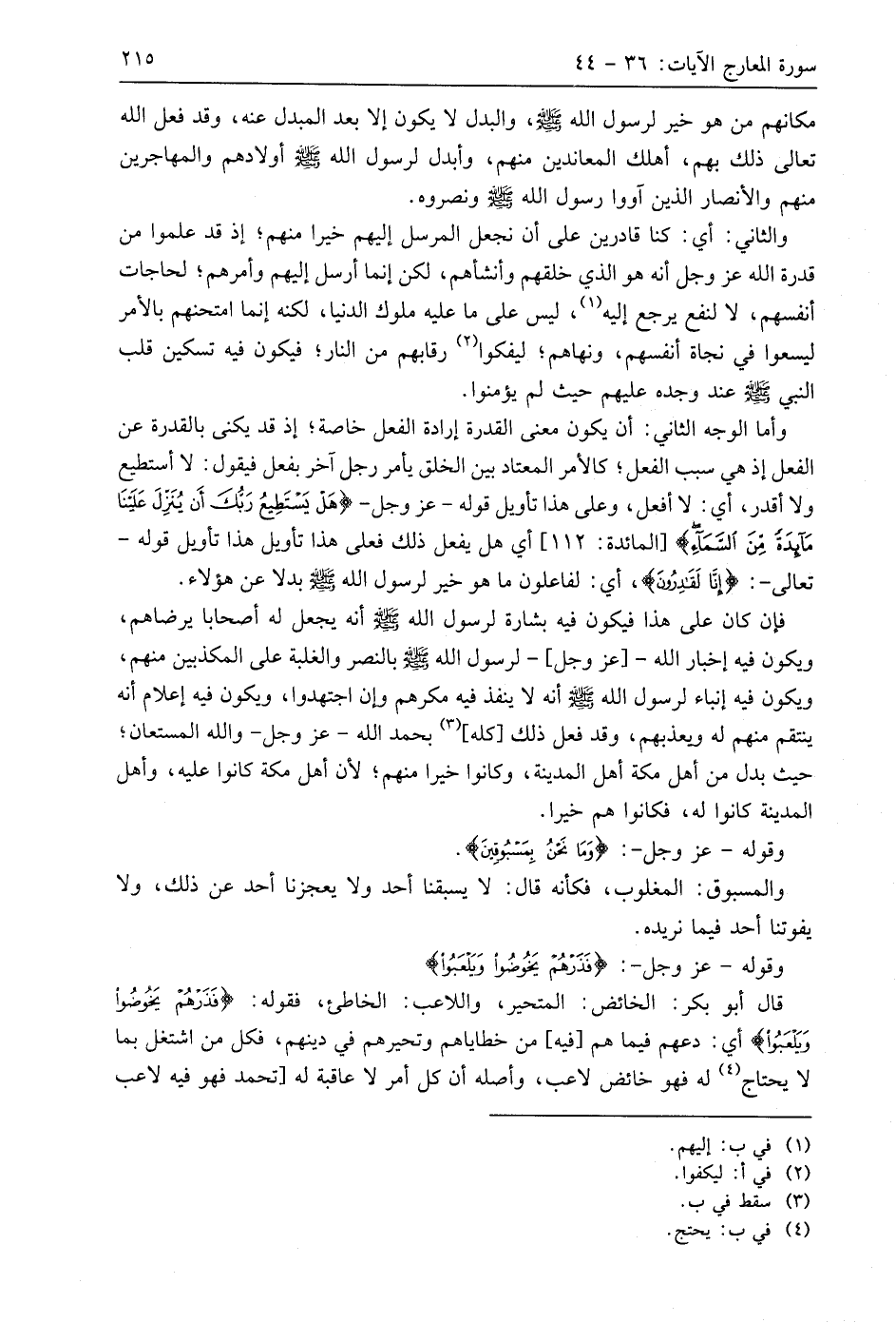 وأما الوجه الثاني: أن يكون معنى القدرة إرادة الفعل خاصة؛ إذ قد يكنى بالقدرة عن الفعل إذ هي سبب الفعل؛ كالأمر المعتاد بين الخلق يأمر رجل آخر بفعل فيقول: لا أستطيع ولا أقدر، أي: لا أفعل، وعلى هذا تأويل قوله - عَزَّ وَجَلَّ - (هَلْ يَسْتَطِيعُ رَبُّكَ أَنْ يُنَزِّلَ عَلَيْنَا مَائِدَةً مِنَ السَّمَاءِ)، أي هل يفعل ذلك فعلى هذا تأويل هذا تأويل قوله - تعالى - (إِنَّا لَقَادِرُونَ)، أي: لفاعلون ما هو خير لرسول اللَّه - صَلَّى اللَّهُ عَلَيهِ وَسَلَّمَ - بدلا عن هَؤُلَاءِ.
