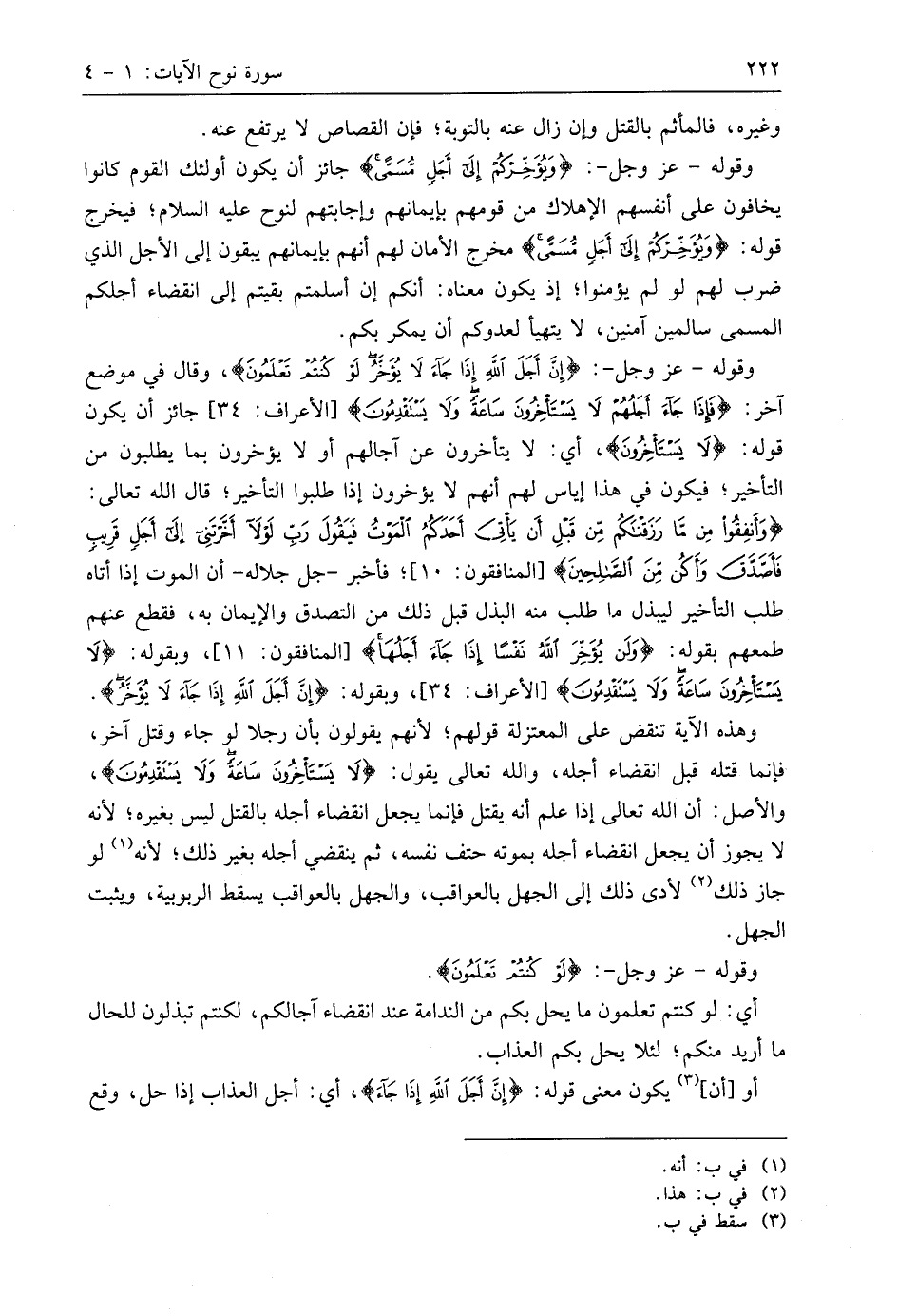 وقوله - عَزَّ وَجَلَّ -: (إِنَّ أَجَلَ اللَّهِ إِذَا جَاءَ لَا يُؤَخَّرُ لَوْ كُنْتُمْ تَعْلَمُونَ)، وقال في موضع آخر: (فَإِذَا جَاءَ أَجَلُهُمْ لَا يَسْتَأْخِرُونَ سَاعَةً وَلَا يَسْتَقْدِمُونَ)، جائز أن يكون قوله: (لَا يَسْتَأْخِرُونَ)، أي: لا يتأخرون عن آجالهم أو لا يؤخرون بما يطلبون من التأخير؛ فيكون في هذا إياس لهم أنهم لا يؤخرون إذا طلبوا التأخير؛ قال اللَّه تعالى: (وَأَنْفِقُوا مِنْ مَا رَزَقْنَاكُمْ مِنْ قَبْلِ أَنْ يَأْتِيَ أَحَدَكُمُ الْمَوْتُ فَيَقُولَ رَبِّ لَوْلَا أَخَّرْتَنِي إِلَى أَجَلٍ قَرِيبٍ فَأَصَّدَّقَ وَأَكُنْ مِنَ الصَّالِحِينَ)؛ فأخبر - جل جلاله - أن الموت إذا أتاه طلب التأخير ليبذل ما طلب منه البذل قبل ذلك من التصدق والإيمان به، فقطع عنهم طمعهم بقوله: (وَلَنْ يُؤَخِّرَ اللَّهُ نَفْسًا إِذَا جَاءَ أَجَلُهَا)، وبقوله: (لَا يَسْتَأْخِرُونَ سَاعَةً وَلَا يَسْتَقْدِمُونَ)، وبقوله: (إِنَّ أَجَلَ اللَّهِ إِذَا جَاءَ لَا يُؤَخَّرُ).