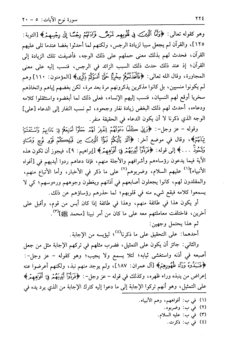 وقوله - عَزَّ وَجَلَّ -: (وَإِنِّي كُلَّمَا دَعَوْتُهُمْ لِتَغْفِرَ لَهُمْ جَعَلُوا أَصَابِعَهُمْ فِي آذَانِهِمْ وَاسْتَغْشَوْا ثِيَابَهُمْ وَأَصَرُّوا وَاسْتَكْبَرُوا اسْتِكْبَارًا (7) وقال في موضع آخر: (أَلَمْ يَأْتِكُمْ نَبَأُ الَّذِينَ مِنْ قَبْلِكُمْ قَوْمِ نُوحٍ وَعَادٍ وَثَمُودَ. . .) إلى قوله: (فَرَدُّوا أَيْدِيَهُمْ فِي أَفْوَاهِهِمْ)، فيجوز أن تكون هذه الآية فيما يدعون رؤساءهم وأشرافهم والأجلة منهم، فإذا دعاهم ردوا أيديهم في أفواه الأنبياء عليهم السلام، وضربوهم على ما ذكر في الأخبار، وأما الأتباع منهم، والمقلدون لهم، كانوا يجعلون أصابعهم في آذانهم ويغطون وجوههم ورءوسهم؛ كي لا يسمعوا كلامه فيقع شيء منه في قلوبهم؛ لما حذرهم رؤساؤهم عن ذلك.