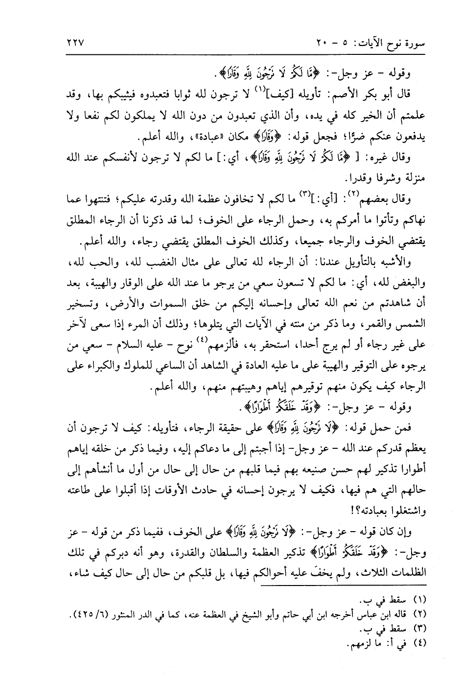 فمن حمل قوله: (لَا تَرْجُونَ لِلَّهِ وَقَارًا) على حقيقة الرجاء، فتأويله: كيف لا ترجون أن يعظم قدركم عند اللَّه - عَزَّ وَجَلَّ - إذا أجبتم إلى ما دعاكم إليه، وفيما ذكر من خلقه إياهم أطوارا تذكير لهم حسن صنيعه بهم فيما قلبهم من حال إلى حال من أول ما أنشأهم إلى حالهم التي هم فيها، فكيف لا يرجون إحسانه في حادث الأوقات إذا أقبلوا على طاعته واشتغلوا بعبادته؟!