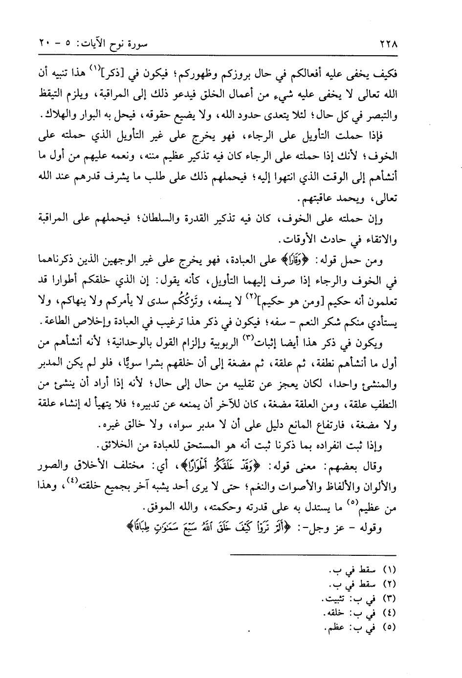 وقَالَ بَعْضُهُمْ: معنى قوله: (وَقَدْ خَلَقَكُمْ أَطْوَارًا)، أي: مختلف الأخلاق والصور والألوان والألفاظ والأصوات والنغم؛ حتى لا يرى أحد يشبه آخر بجميع خلقته، وهذا من عظيم ما يستدل به على قدرته وحكمته، واللَّه الموفق.