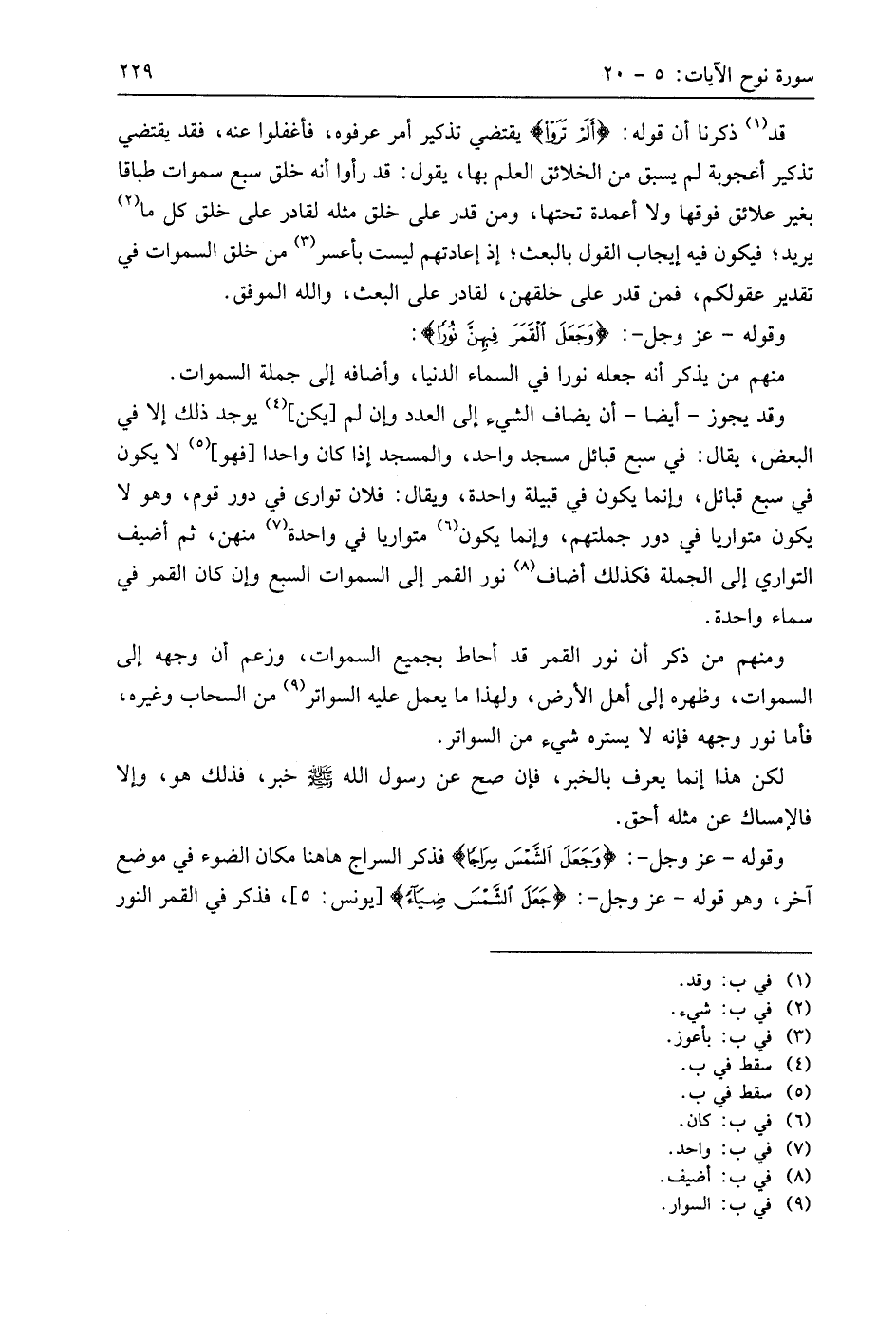 وقوله - عَزَّ وَجَلَّ -: (وَجَعَلَ الشَّمْسَ سِرَاجًا) فذكر السراج هاهنا مكان الضوء في موضع آخر، وهو قوله - عَزَّ وَجَلَّ -: (جَعَلَ الشَّمْسَ ضِيَاءً)، فذكر في القمر النور