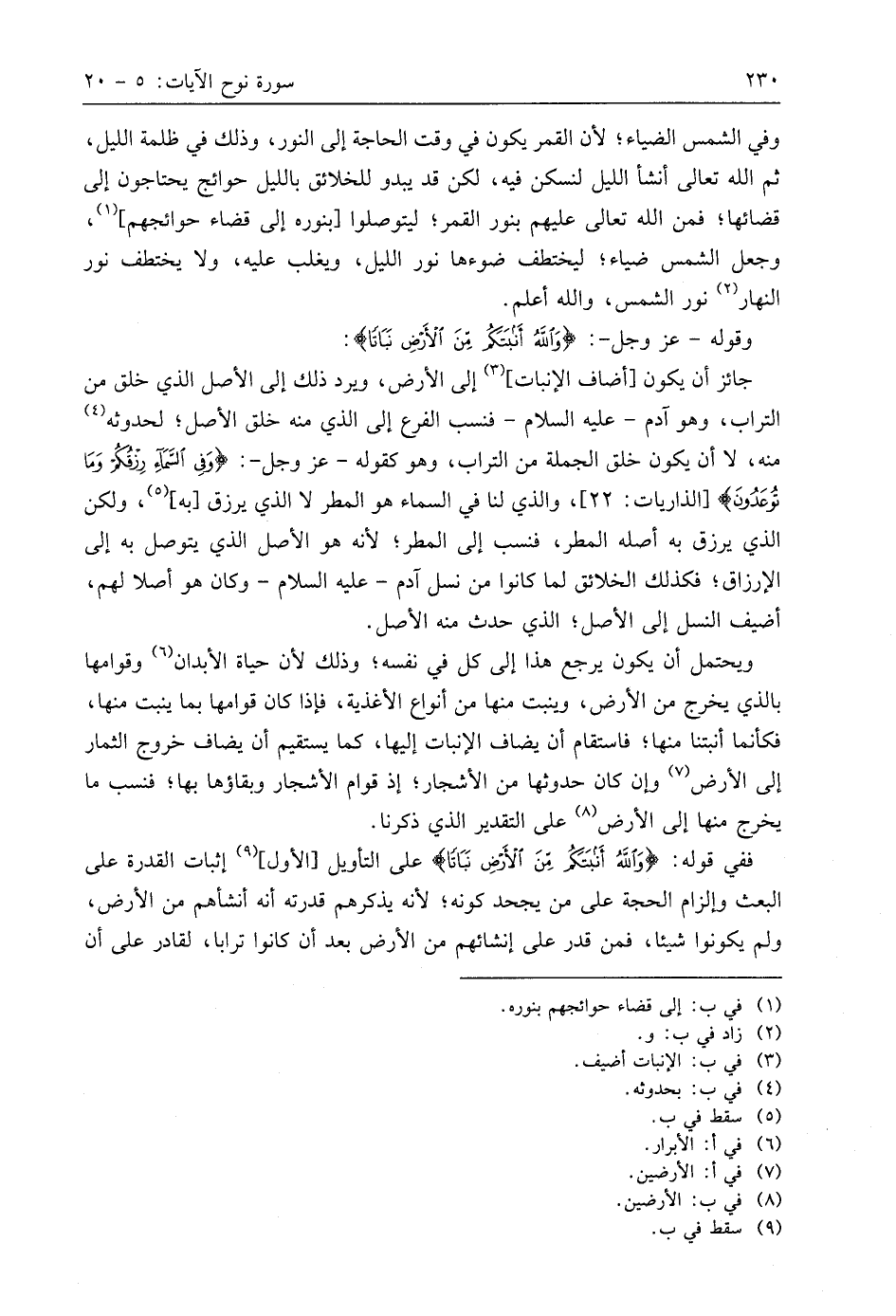 ويحتمل أن يكون يرجع هذا إلى كل في نفسه؛ وذلك لأن حياة الأبدان وقوامها بالذي يخرج من الأرض، وينبت منها من أنواع الأغذية، فإذا كان قوامها بما ينبت منها، فكأنما أنبتنا منها؛ فاستقام أن يضاف الإنبات إليها، كما يستقيم أن يضاف خروج الثمار إلى الأرض وإن كان حدوثها من الأشجار؛ إذ قوام الأشجار وبقاؤها بها؛ فنسب ما يخرج منها إلى الأرض على التقدير الذي ذكرنا.