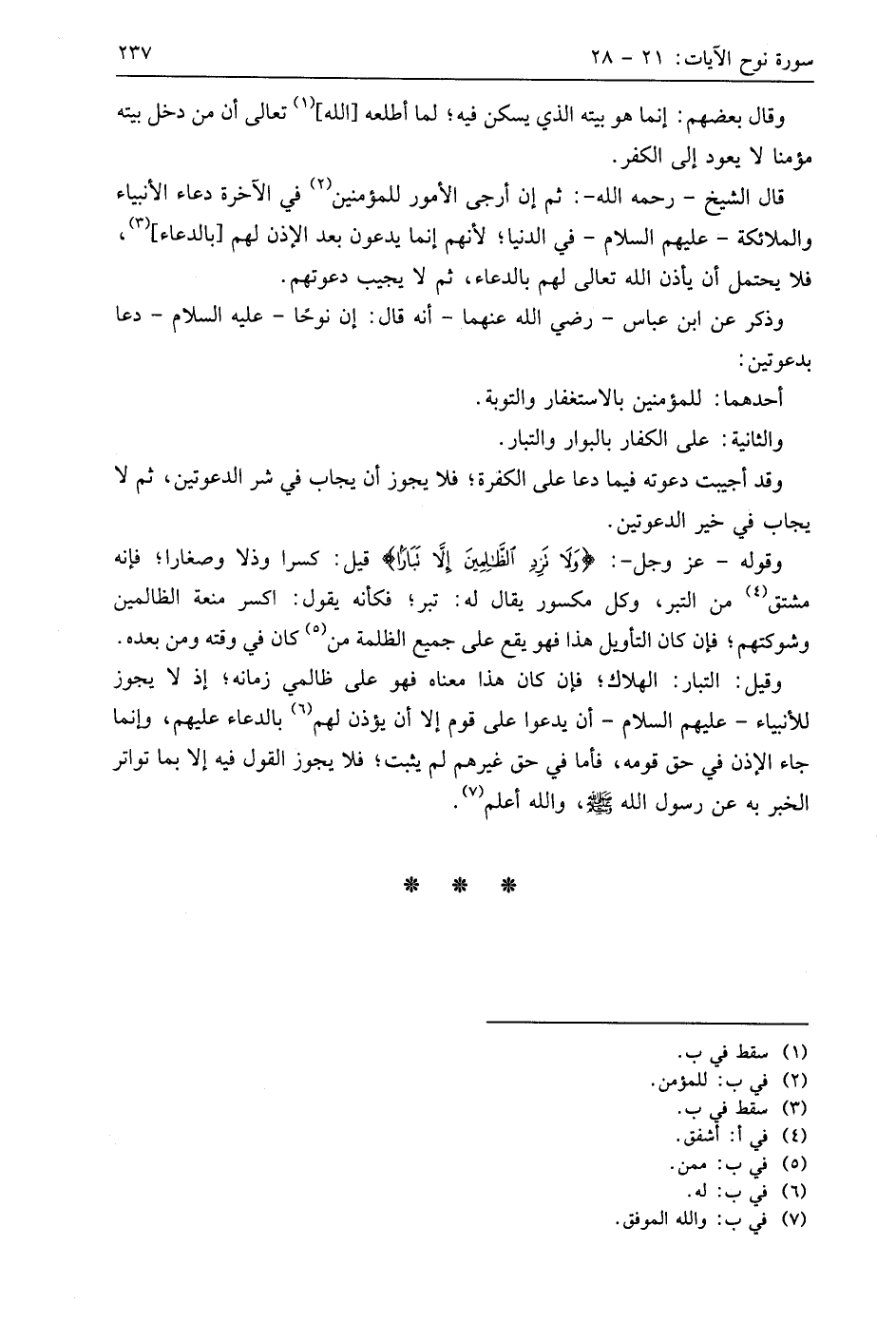 وقيل: التبار: الهلاك؛ فإن كان هذا معناه فهو على ظالمي زمانه؛ إذ لا يجوز للأنبياء - عليهم السلام - أن يدعوا على قوم إلا أن يؤذن لهم بالدعاء عليهم، وإنما جاء الإذن في حق قومه، فأما في حق غيرهم لم يثبت؛ فلا يجوز القول فيه إلا بما تواتر الخبر به عن رسول اللَّه - صَلَّى اللَّهُ عَلَيهِ وَسَلَّمَ -، واللَّه أعلم.