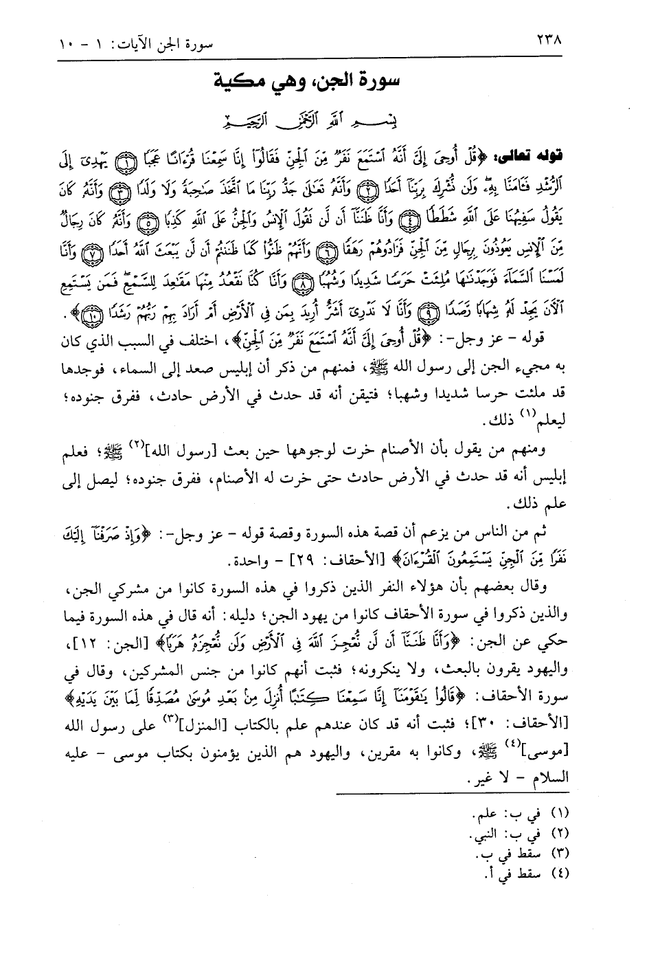 ثم من الناس من يزعم أن قصة هذه السورة وقصة قوله - عَزَّ وَجَلَّ -: (وَإِذْ صَرَفْنَا إِلَيْكَ نَفَرًا مِنَ الْجِنِّ يَسْتَمِعُونَ الْقُرْآنَ) - واحدة.