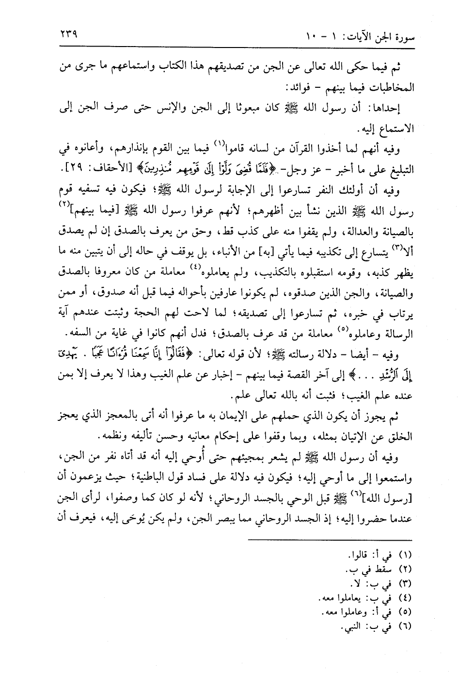 وفيه أن رسول اللَّه - صَلَّى اللَّهُ عَلَيهِ وَسَلَّمَ - لم يشعر بمجيئهم حتى أُوحي إليه أنه قد أتاه نفر من الجن، واستمعوا إلى ما أوحي إليه؛ فيكون فيه دلالة على فساد قول الباطنية؛ حيث يزعمون أن رسول اللَّه - صَلَّى اللَّهُ عَلَيهِ وَسَلَّمَ - قبل الوحي بالجسد الروحاني؛ لأنه لو كان كما وصفوا، لرأى الجن عندما حضروا إليه؛ إذ الجسد الروحاني مما يبصر الجن، ولم يكن يُوحَى إليه، فيعرف أن